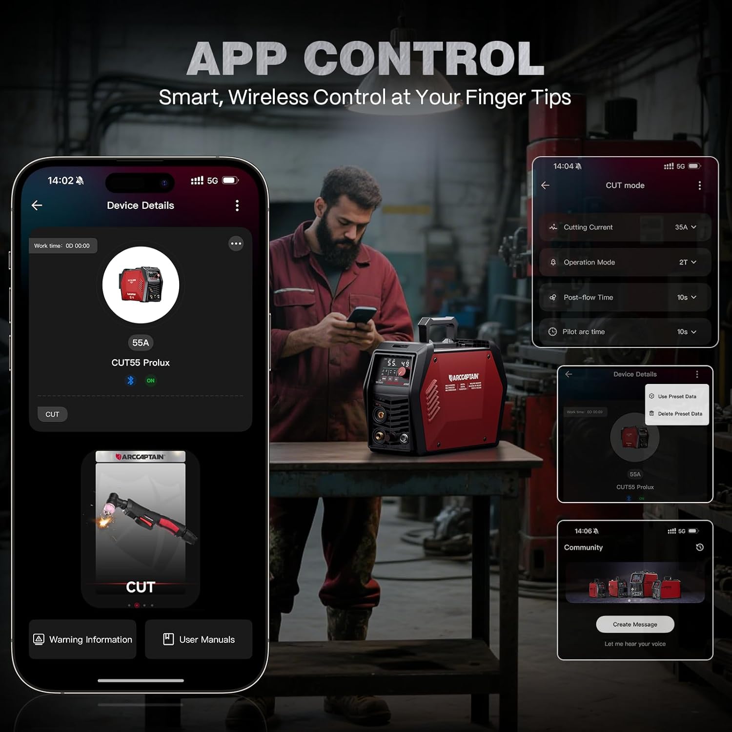 ARCCAPTAIN iControl CUT55 Prolux Plasma Cutter Machine, [APP Control] 55 Amp Non-Touch Pilot Arc, 120V/240V, Upgraded LED Display, Grid Cutting, Rust Removal, Air Pressure Detection for Home DIY