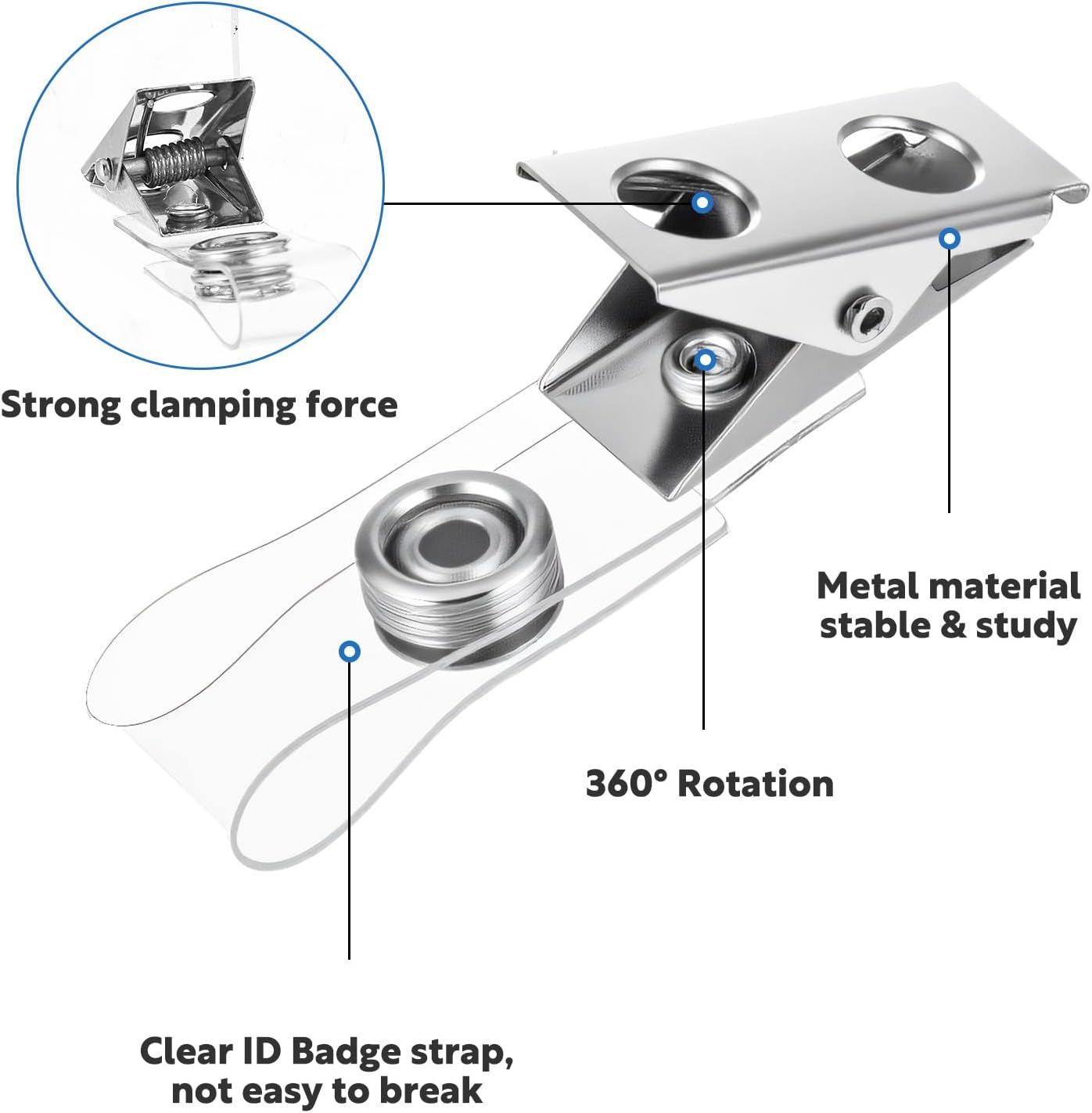 300 Pcs Metal Badge Clips with Clear PVC Straps – Double Hole ID Card Clips for Name Tags, Badge Holders & Office Use