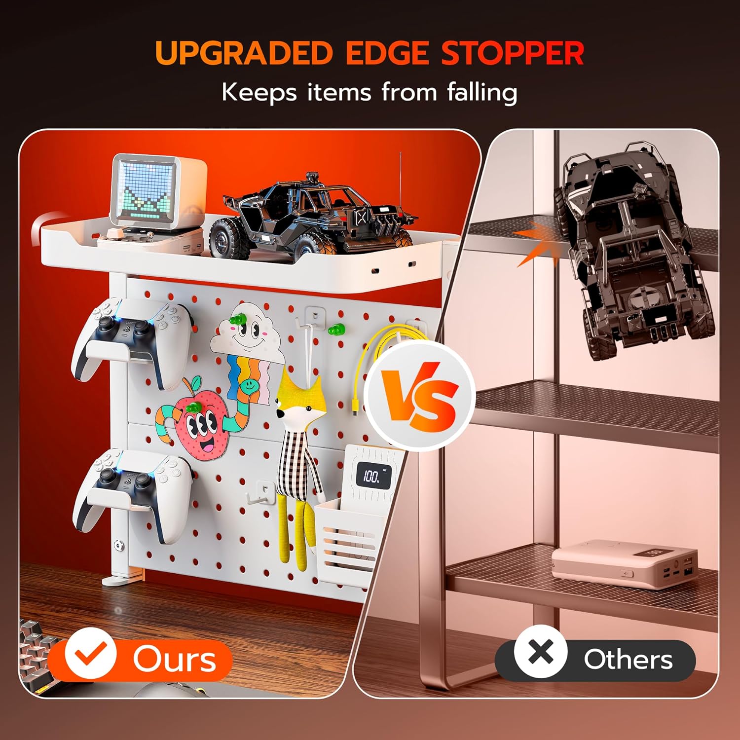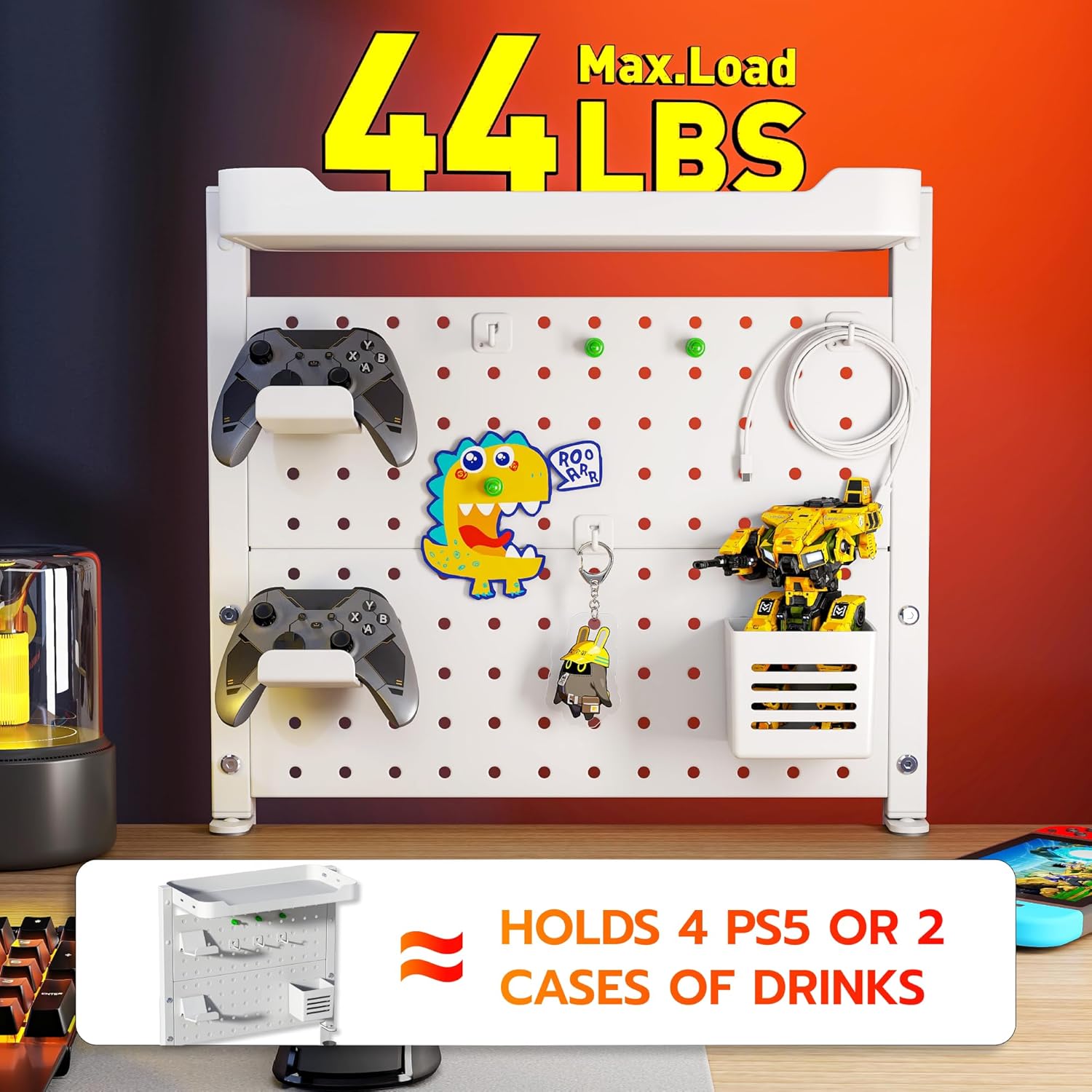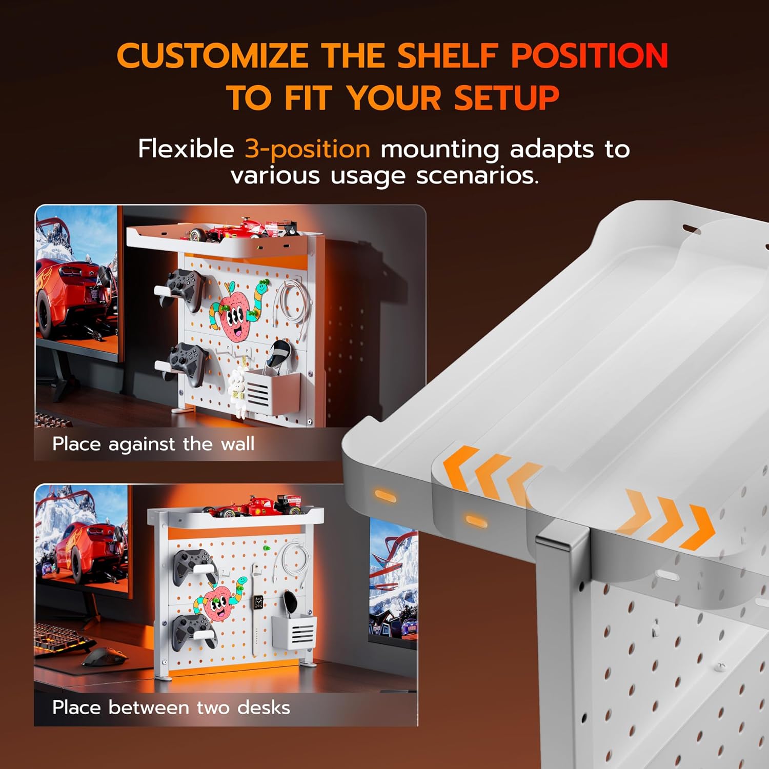 - ăCustomizable with AccessoriesăThis peg board shelf offers unparalleled flexibility with its edge-mounted design, supporting both above and under desk configurations. Use the above-desk setup for easy access to frequently used daily items, or opt for the under-desk installation to store cables, chargers, or hidden peripherals discreetly. It includes 2 controller holders, 1 pen holder, 3 magnets, and 3 hooks, allow you to fully customize the setup to suit your specific needs.