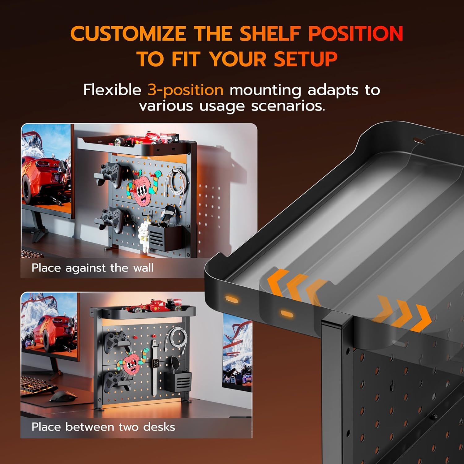 ARES WING Desk Clamp On Pegboard with 16 inches Organizer Shelf, Adjustable Above or Under Desk Storage Shelf Holds 44 lbs, Magnetic Metal Peg Board for Office and Gaming Accessories, Black