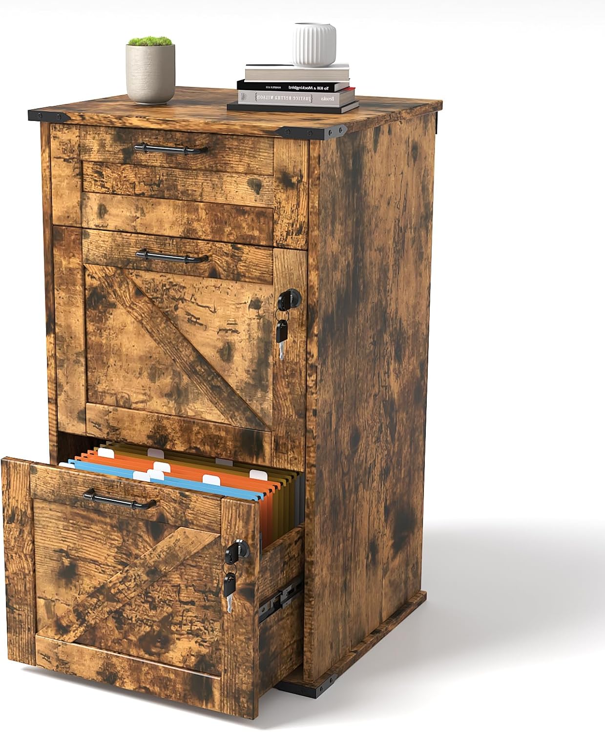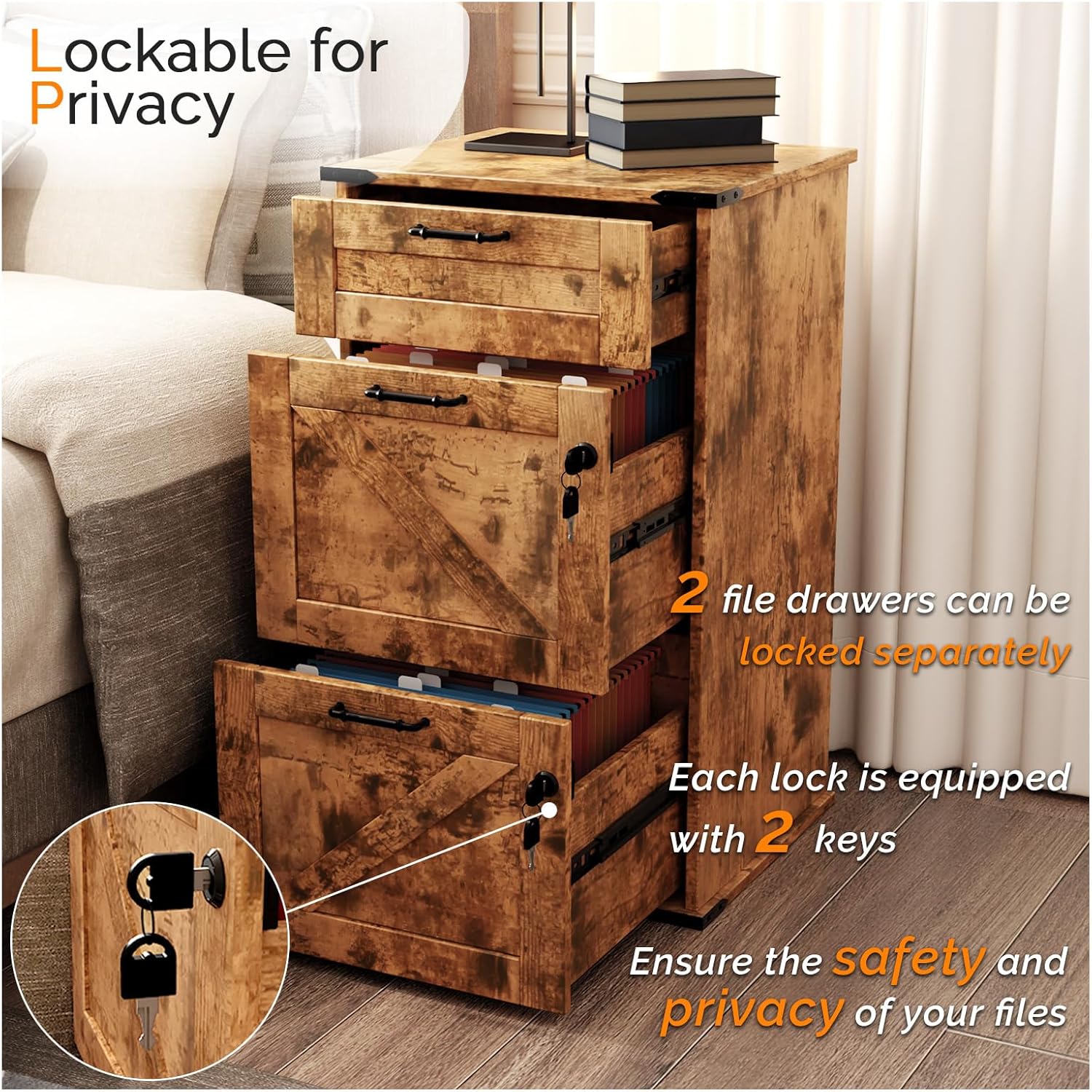 VINGLI 3 Drawer File Cabinet with Lock, Home Office Filing Organizer, for Letter Size File Folder Storage, Modern Farmhouse Style, Wood Vertical Filing Cabinet, Archivador (Rustic Brown)