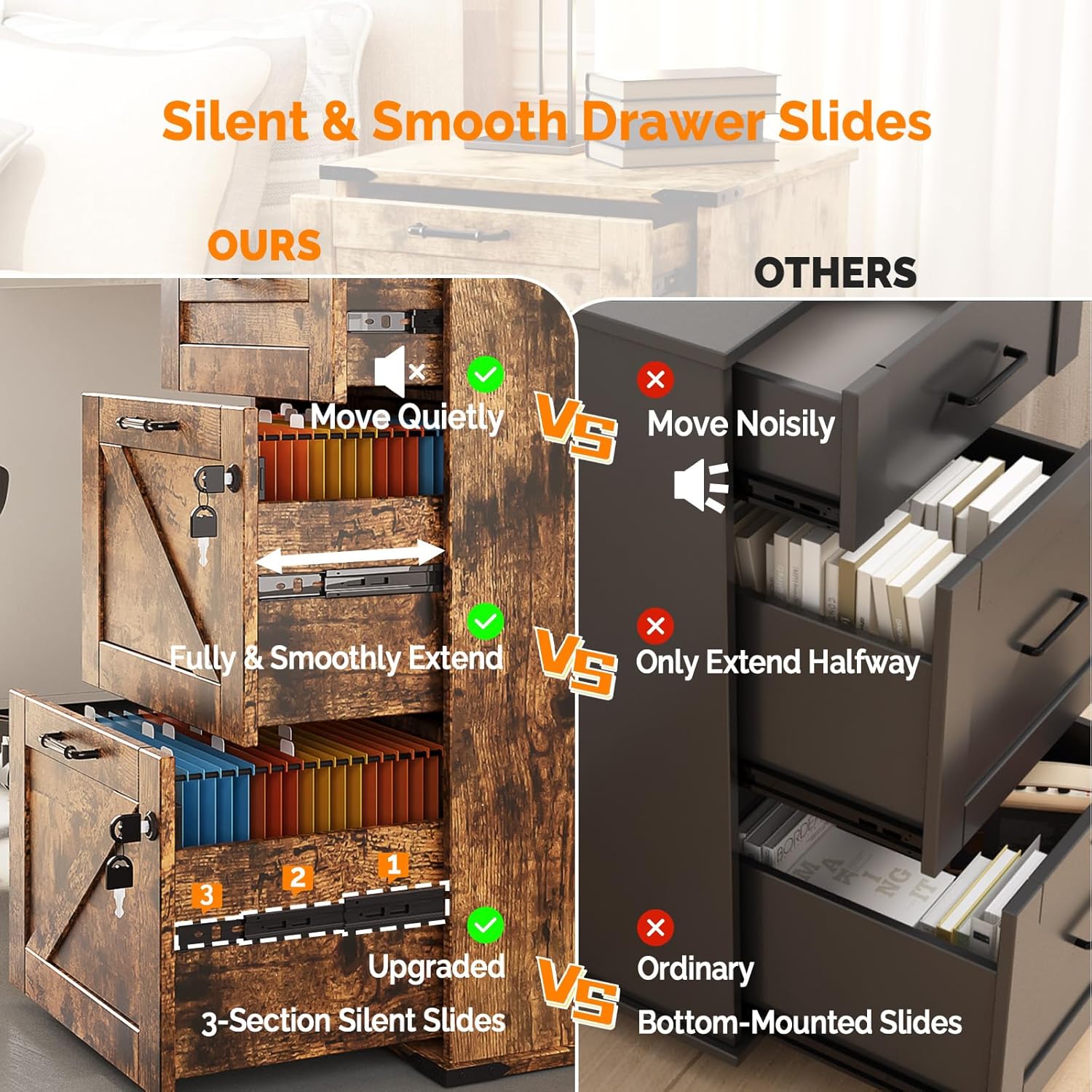 - ăSilent Sliding PerfectionăThe three-section slides ensure the drawers extend fully and smoothly, without a hint of noise, making it convenient for you to search for and access your file folders.