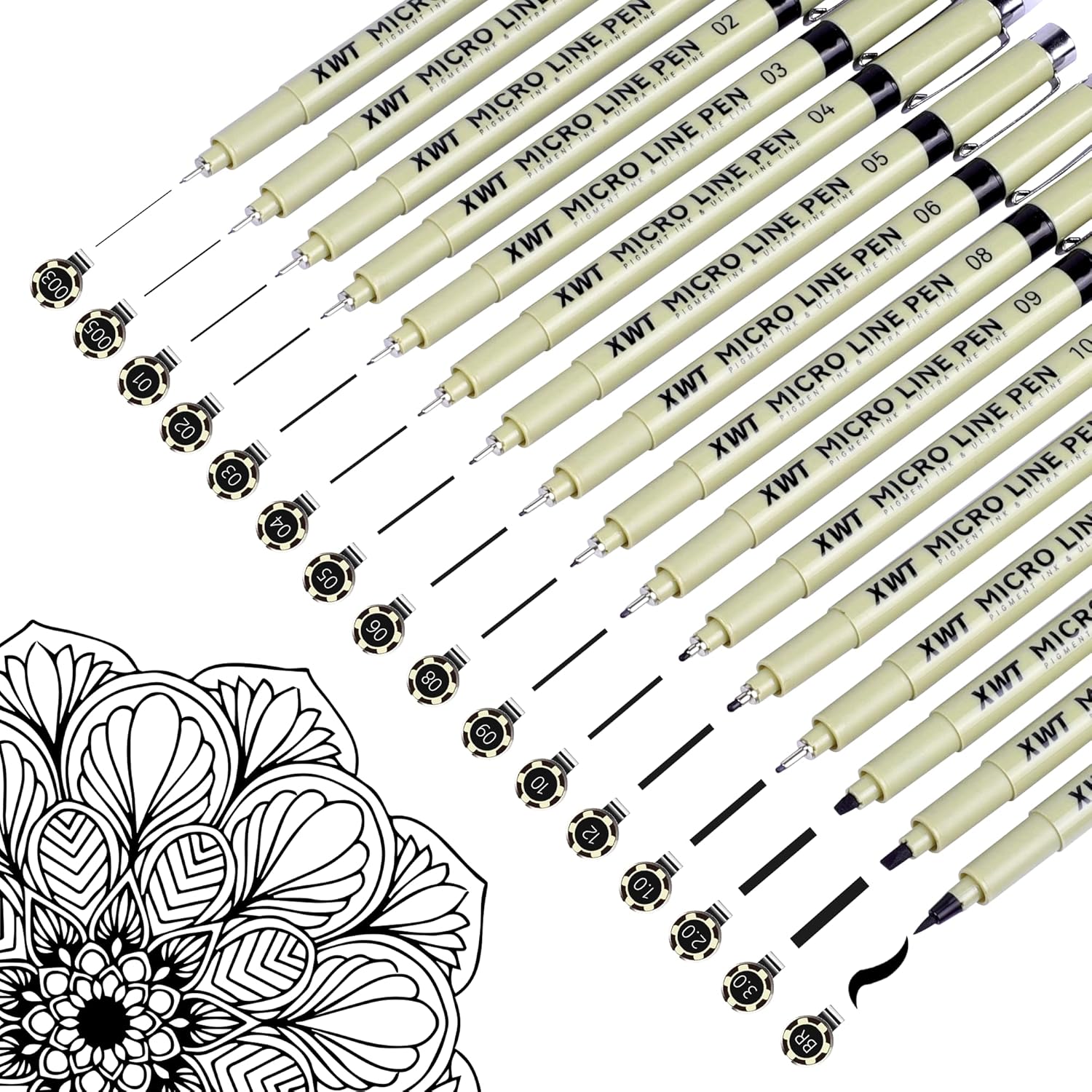 - Precision Nib Sizes: This set includes 16 black drawing pens with nib sizes ranging from 0.15mm to 3.0mm, plus a brush marker (BR). Perfect for line art, outlines, illustrations, drafting, and hand lettering.Each pen is clearly marked with its nib size on the pen body: 0.15mm (003), 0.20mm (005), 0.25mm (01), 0.30mm (02), 0.35mm (03), 0.40mm (04), 0.45mm (05), 0.50mm (06), 0.55mm (08), 0.65mm (09), 0.75mm (10), 0.85mm (12), 1.0mm (1.0), 2.0mm (2.0), 3.0mm (3.0), Brush marker (BR).