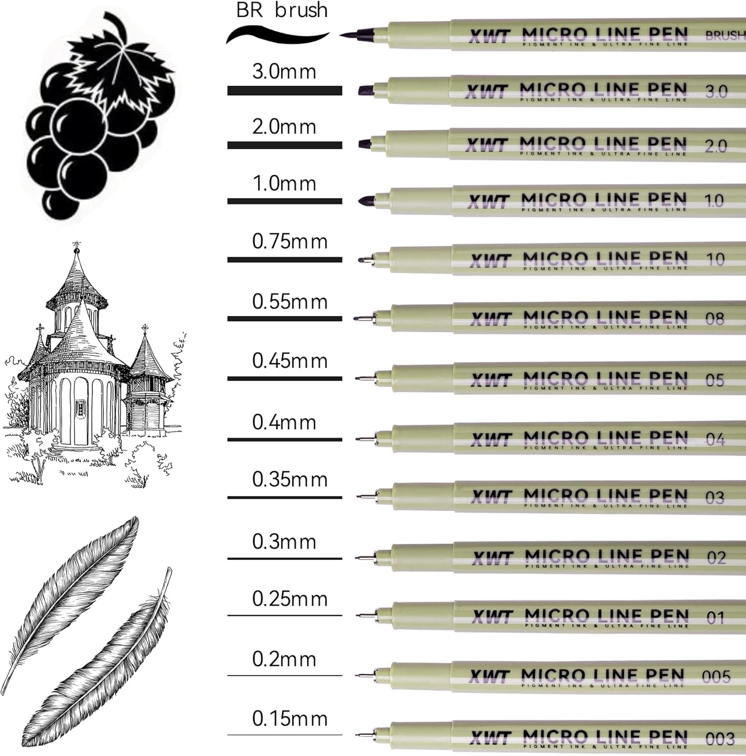 - Precision Nib Sizes: This set includes 13 black drawing pens with nib sizes ranging from 0.15mm to 3.0mm, plus a brush marker (BR). Perfect for line art, outlines, illustrations, drafting, and hand lettering.Each pen is clearly marked with its nib size on the pen body: 0.15mm (003), 0.20mm (005), 0.25mm (01), 0.30mm (02), 0.35mm (03), 0.40mm (04), 0.45mm (05), 0.55mm (08), 0.75mm (10), 1.0mm (1.0), 2.0mm (2.0), 3.0mm (3.0), Brush marker (BR).