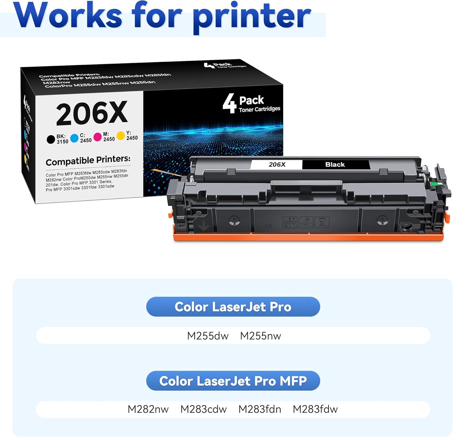 - 206X Toner Cartridge Set Compatible For: Color LaserJet Pro M255dw, M255nw; HP Color LaserJet Pro MFP M282nw, M283cdw, M283fdn, M283fdw