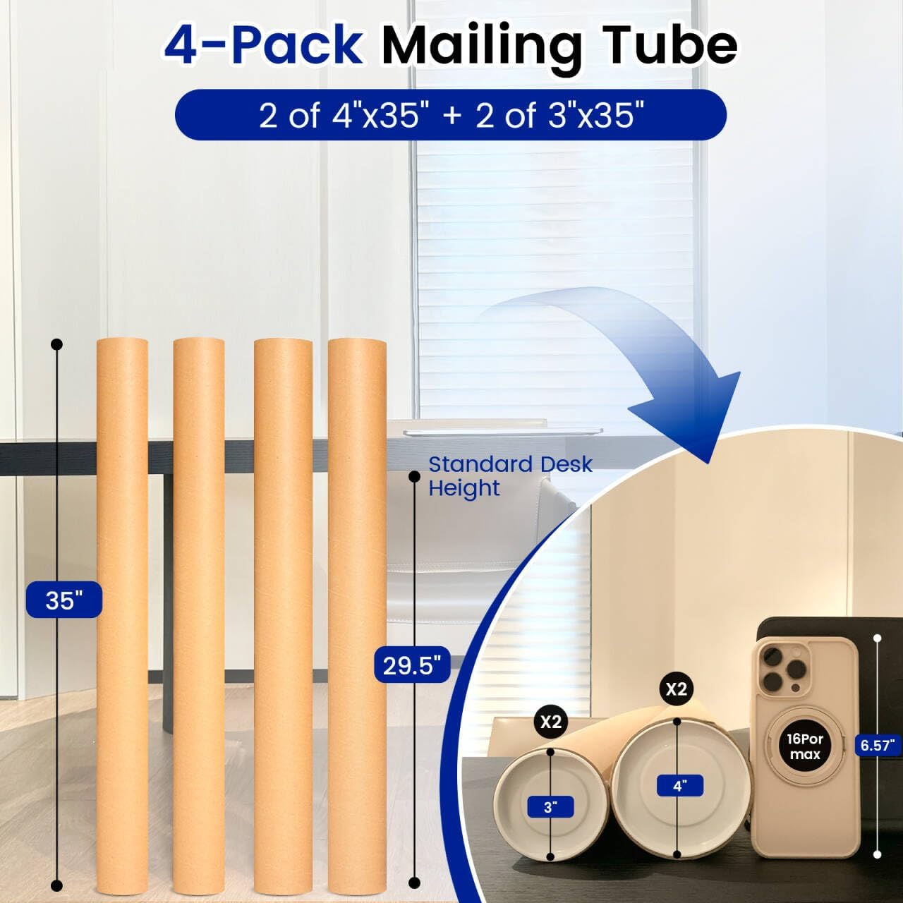 4-Pack Mailing Tubes with Caps, Paper Cardboard Storage Tubes for Shipping, Prints, Documents, Crafts & Golf Clubs (4in*35in, 3in*35in)