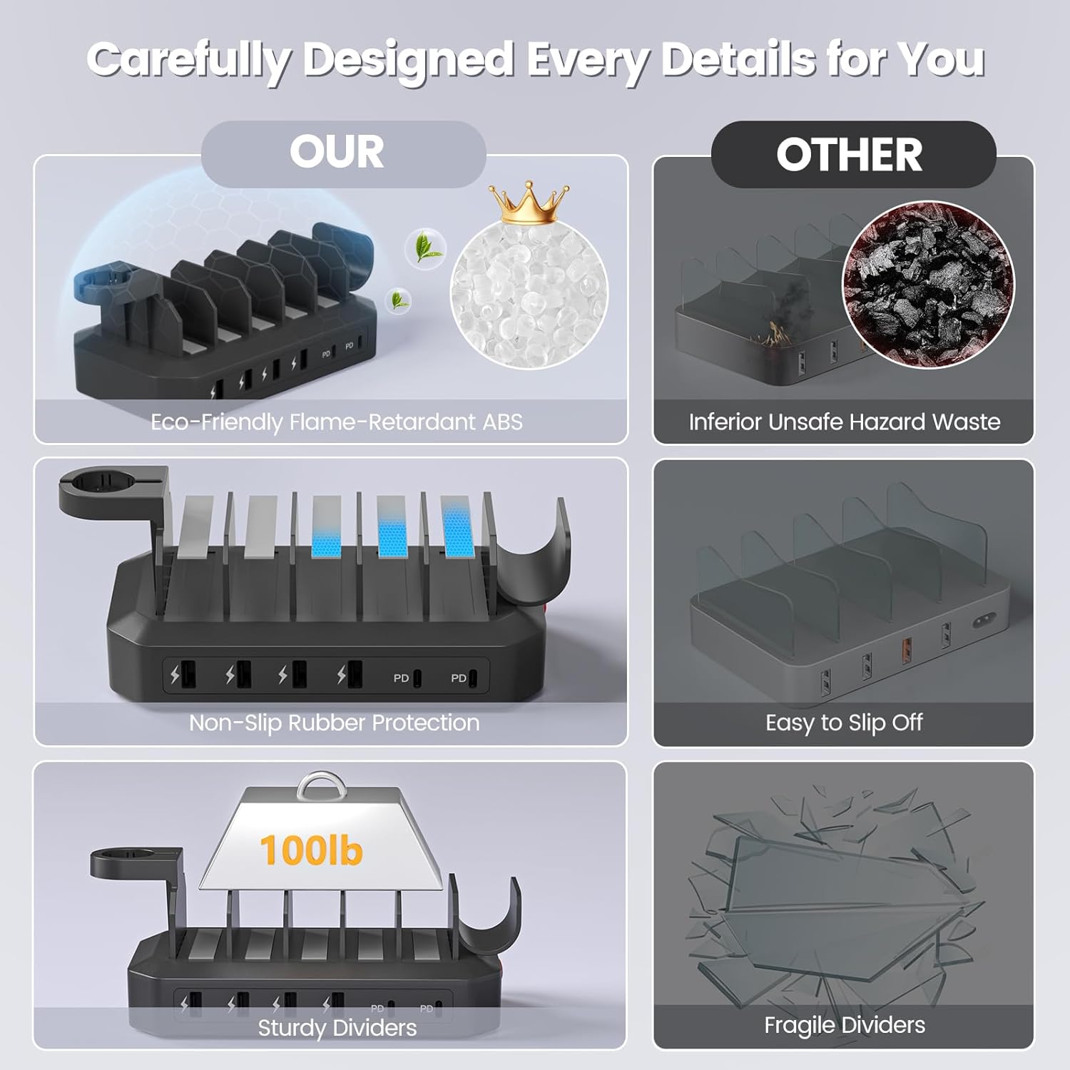 - 👍【Desk Organizer & Space Saver】With anti-slip rubber pads Design, this Sleek Charging Organizer usb c charging station is able to protect desk’s surface from scratch, and greatly protect your device from being damaged. It's perfect for the whole family. Unlike other charging stations with fragile dividers, ours crafted with sturdy PC, designed wider and taller slots, you can move the dividers to stack whatever thickness of tablet or phone. Ours help you organize all devices in one place.