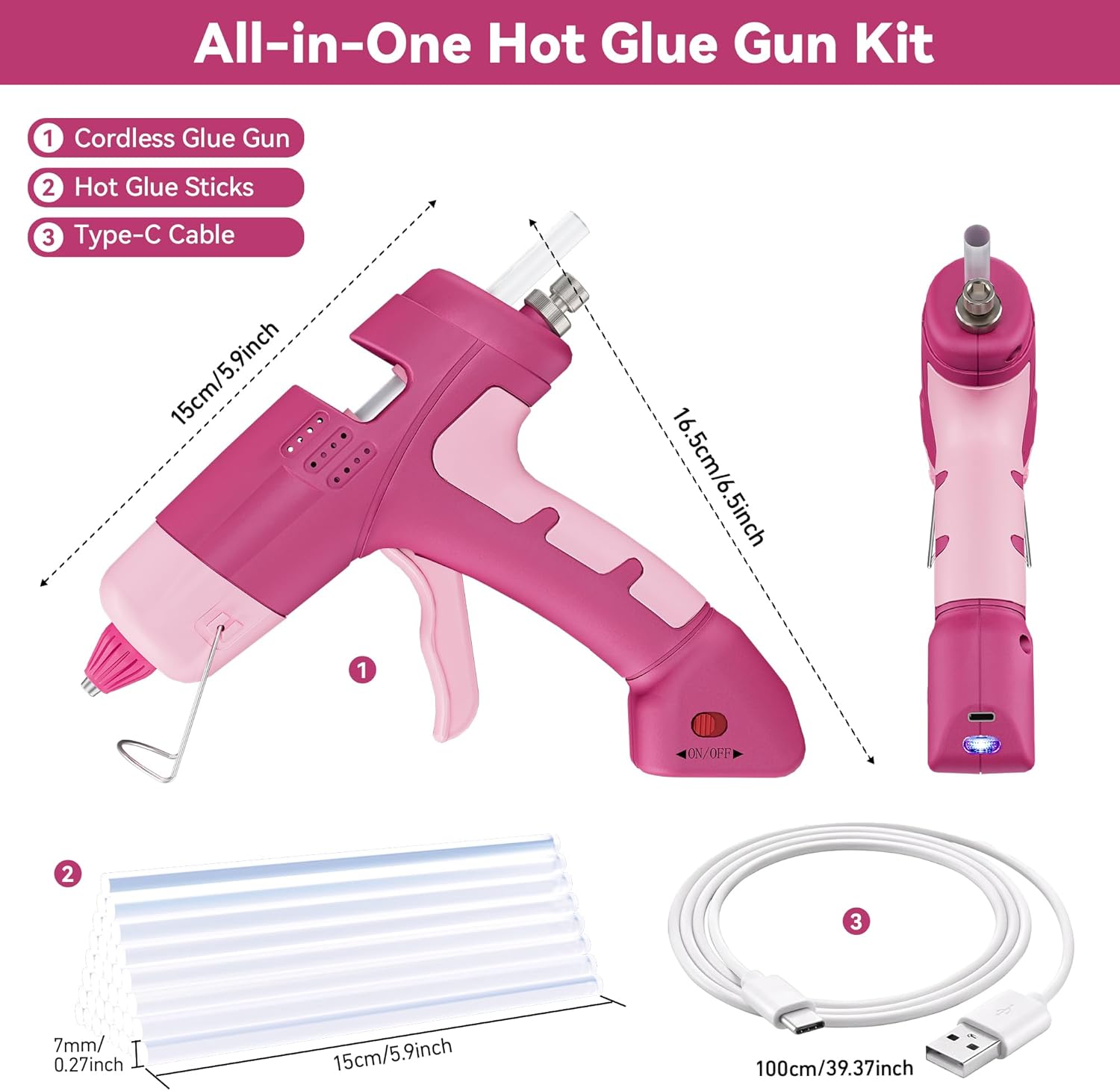 - Cordless Hot Glue Gun Kit:This hot glue gun and sticks set include 1 cordless hot glue gun,30pcs glue sticks(7*150MM),1 Type-C charging cable,1 manual.Say goodbye to the limitations of cords and enjoy unrestricted movement during your projects