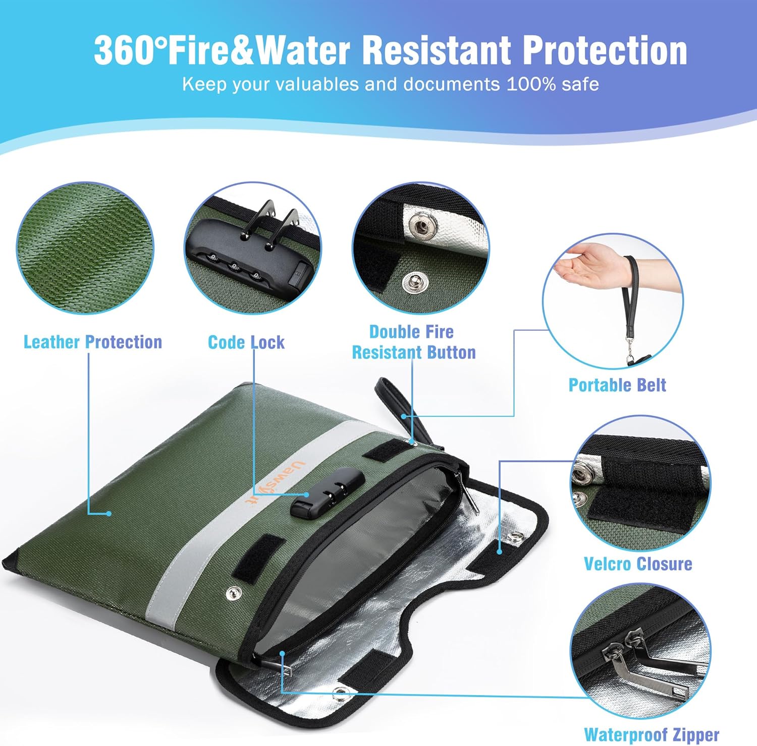 - 【5200℉ Fireproof & Water-Resistant】Our fireproof money bag was Made of premium silicone-coated fiberglass, thermal insulation cotton and aluminum foil, which can withstand temperatures up to 5200°F. And the fireproof document bag was designed with 360° waterproof function, so you don't have to worry about your important documents getting wet from the rain.
