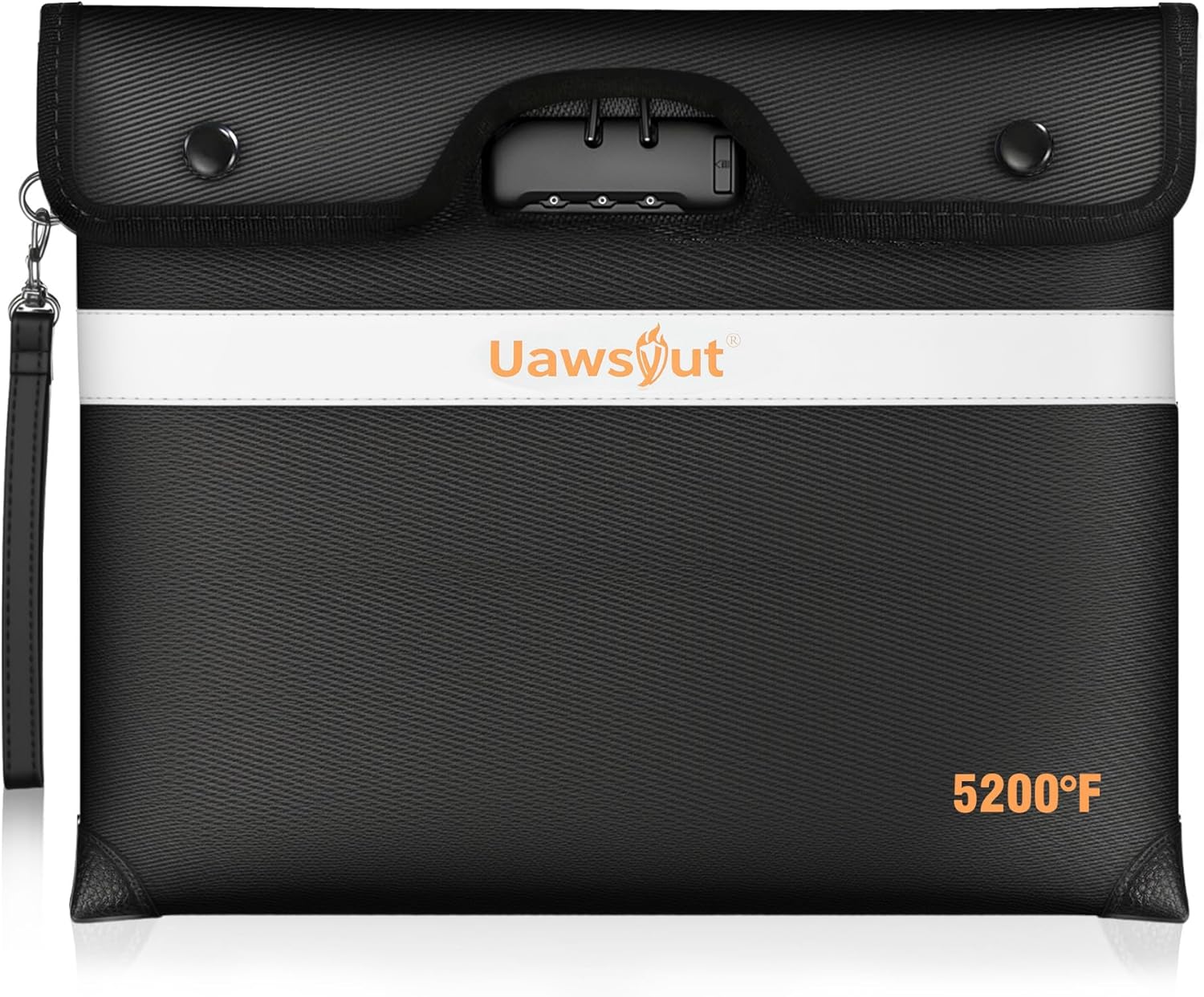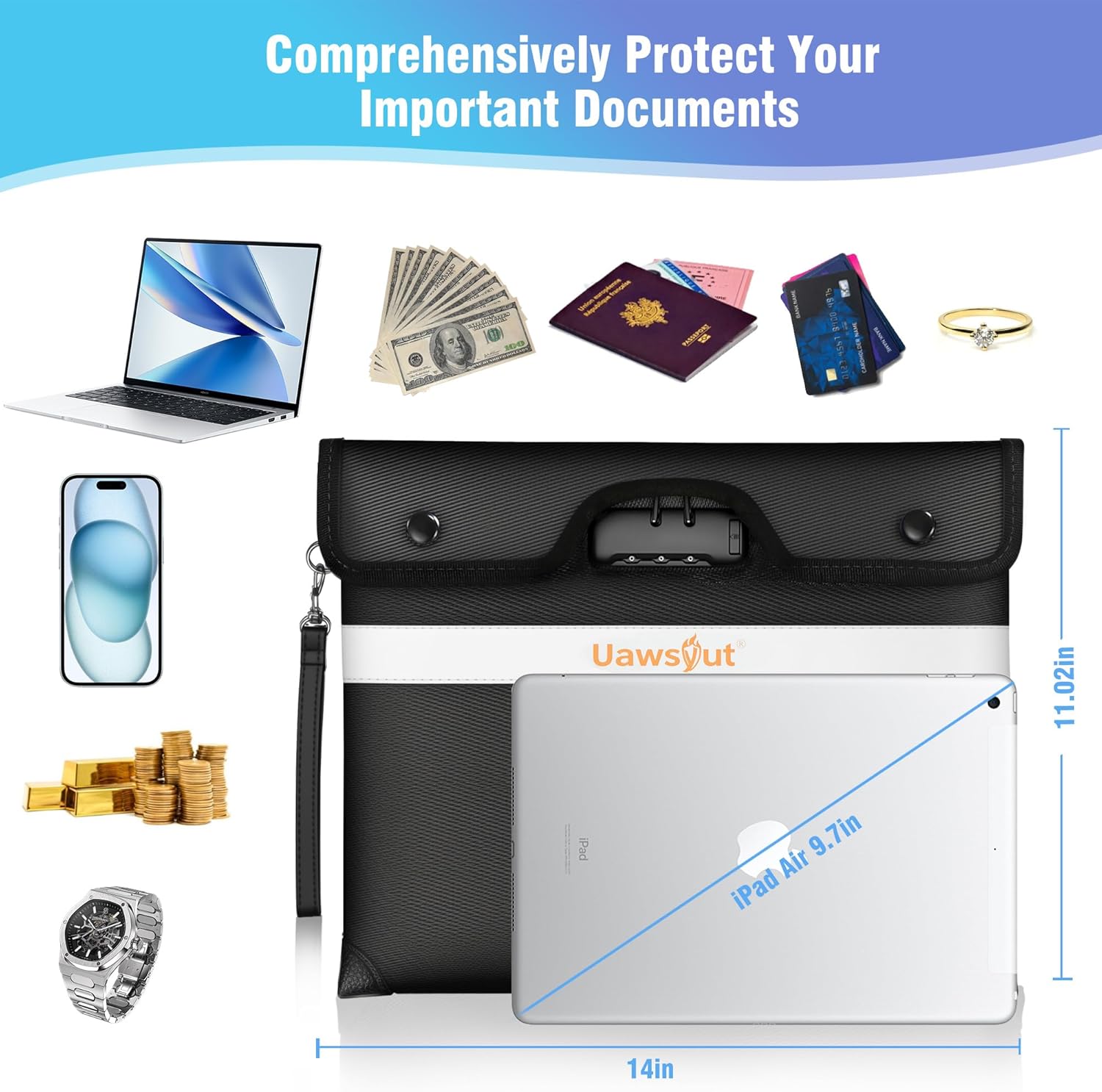 5200℉ Fireproof Document Bag with Lock, Portable Money Bag with Zipper Closure, Waterproof Envelope with Reflective Strip for A4 Letter, Tablet, Valuables, Cash and Passport(14.3"x11.2", Black)