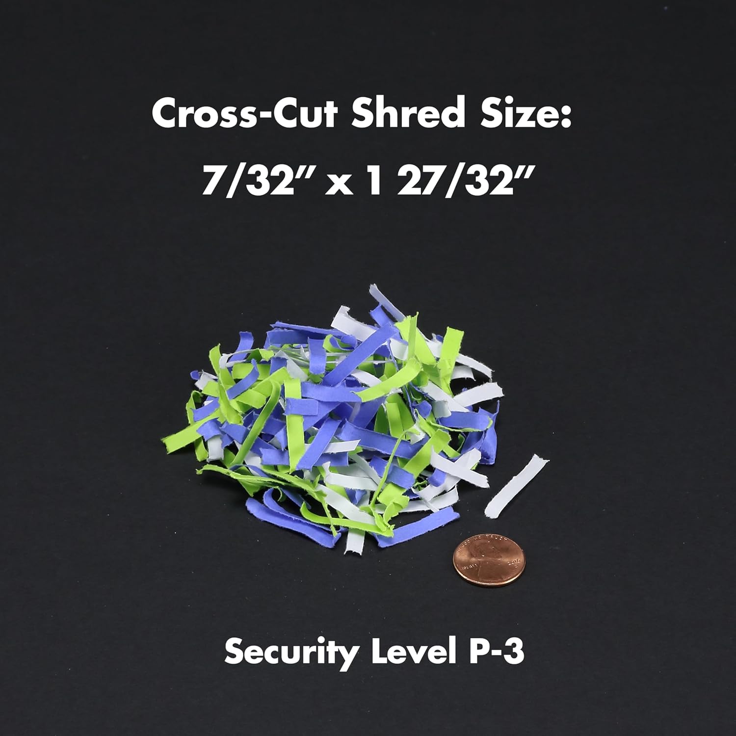 - Shreds paper and credit cards into small pieces (7/32 by 1-27/32 inches), security level P-3