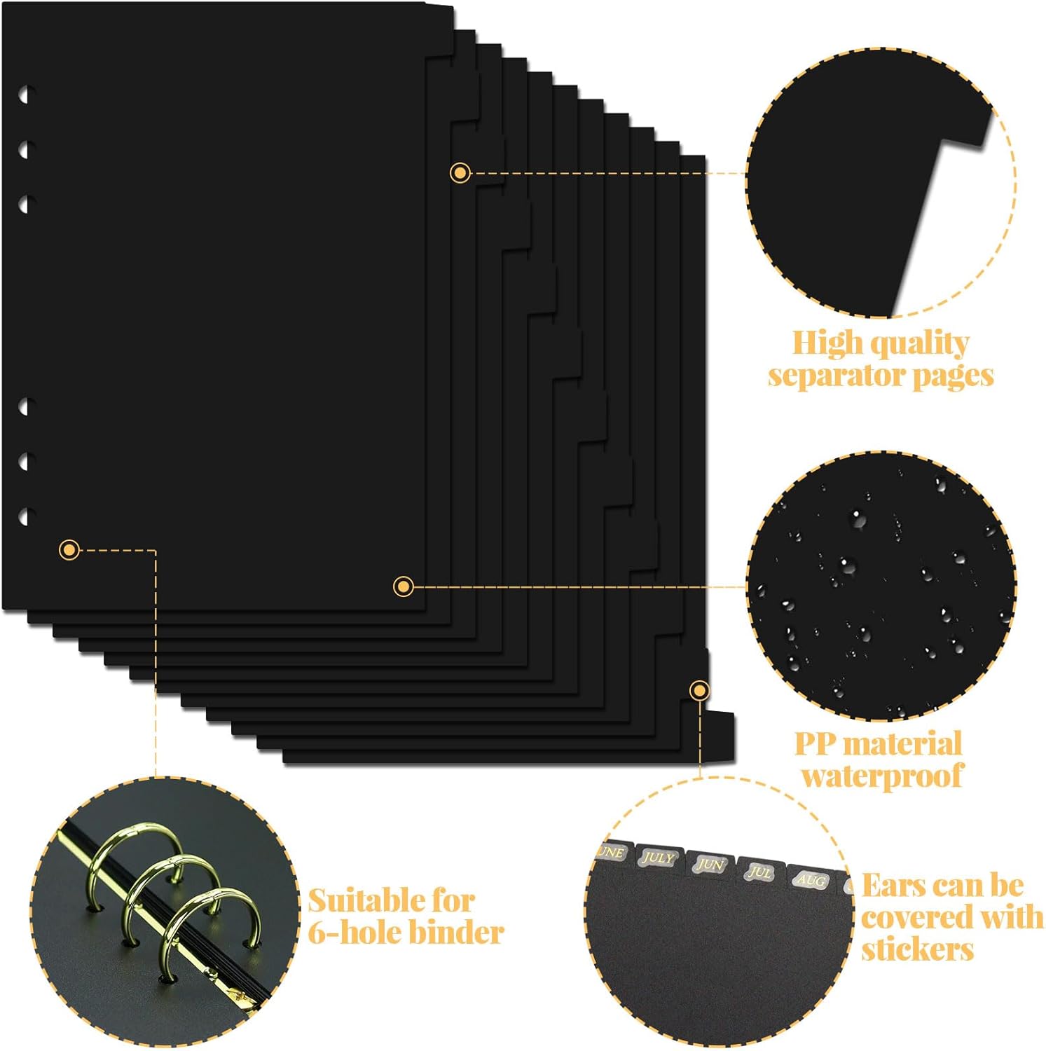 A5 Plastic Binder Dividers 6 Holes Durable Plastic Tab Dividers for 6-Ring Binders, Notebooks, Planners, 5.7x8.3 inch (Black, 12 tab)