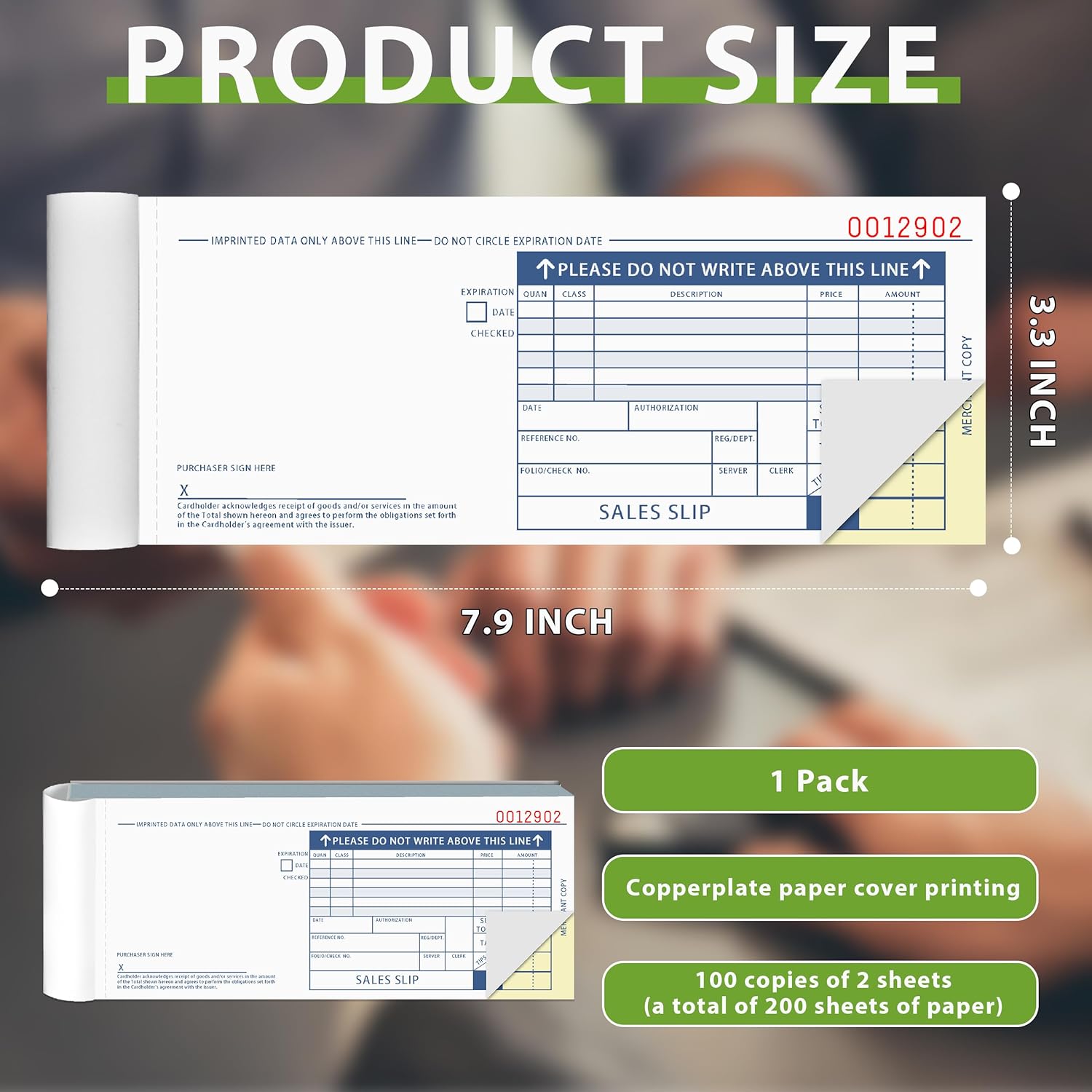 - Short Credit Card Sales Slips: 7.9 * 3.3inch. Designed for portability and ease of use, these compact sales receipt books provide ample space to record detailed transaction information without adding bulk. Perfect for on-the-go operations and organized record-keeping.Designed for portability and ease of use, these compact sales receipt books provide ample space to record detailed transaction information without adding bulk. Perfect for on-the-go operations and organized record-keeping.Designed for portability and ease of use, these compact sales receipt books provide ample space to record detailed transaction information without adding bulk.