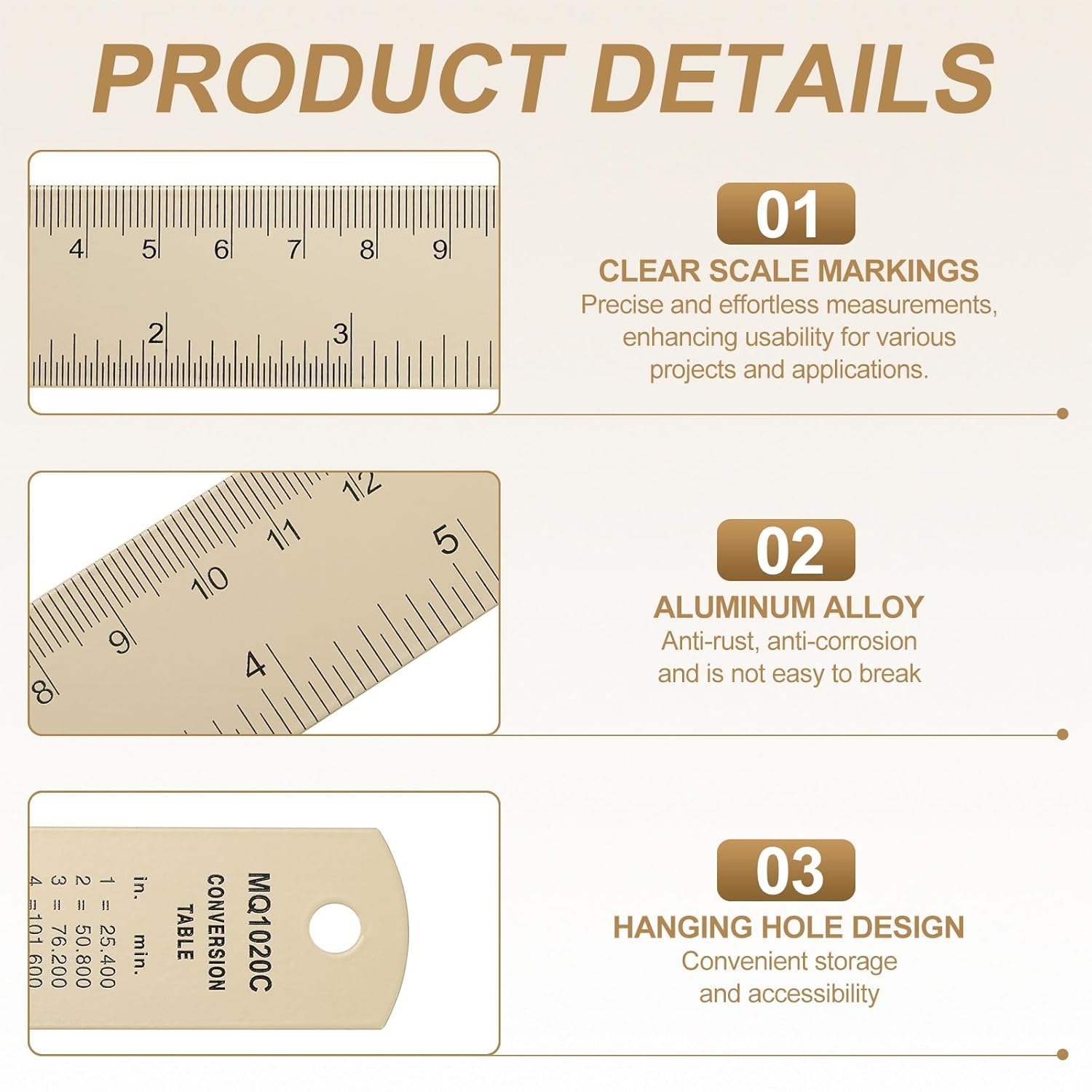 - Feature - The ruler features ink printing technology on its surface, ensuring that the scale is clear and sharp, remaining non-fading and non-blurring even after long-term use. It has a dual-scale design, and the back is carefully printed with a complete set of conversion formula for metric and SAE units, allowing beginners to quickly master unit conversion skills. Additionally, it includes a hanging hole design for convenient storage and accessibility.