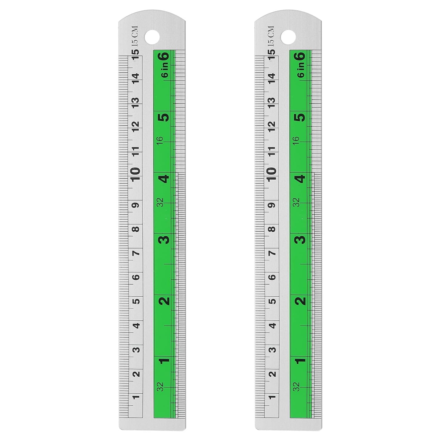 HARFINGTON 2pcs Metal Straight Ruler 15cm Metric SAE Aluminum Alloy Measuring Rulers Scale Tool with Hole for Measure Study Reading Classroom Office, Green