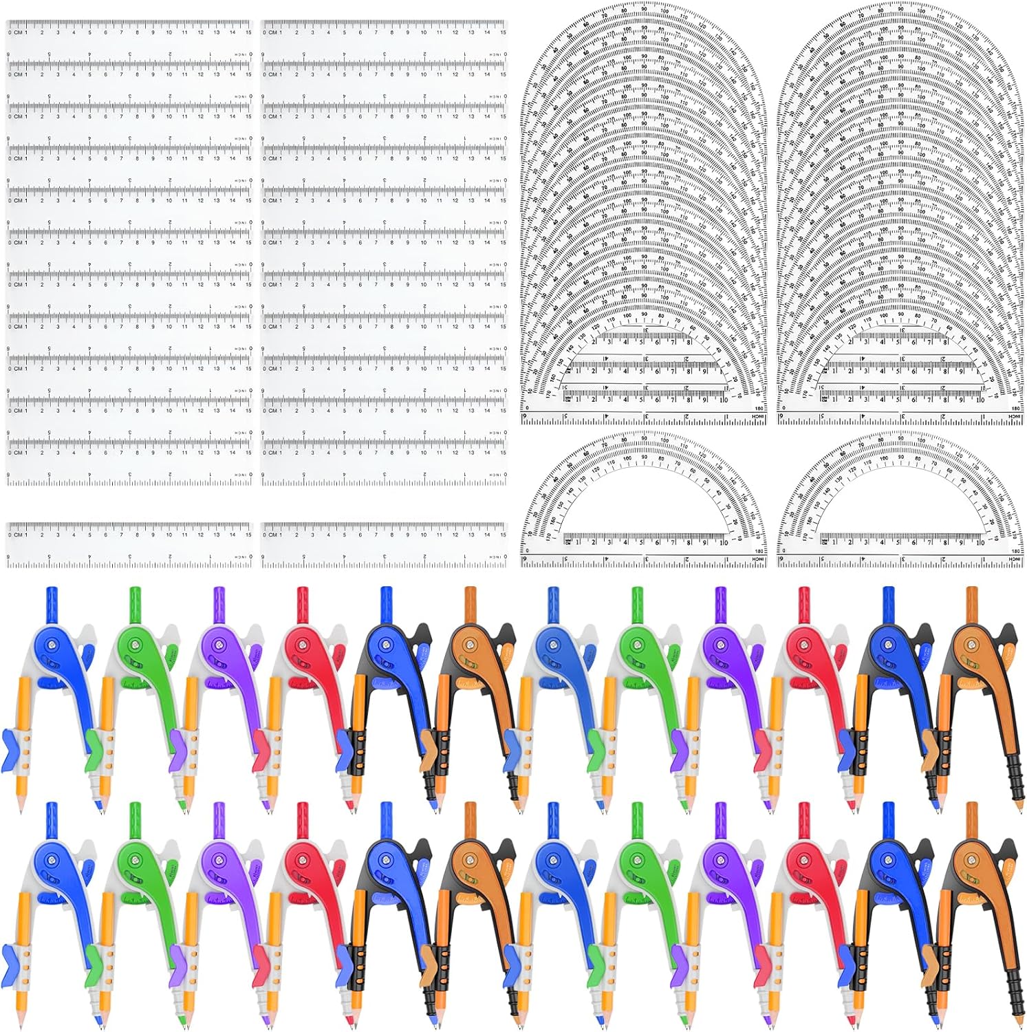 - Vibrant Colors: The geometry compass set includes 24 pieces math compasses in different colors--pink, sky blue, green, purple, blue, and orange(4 of each color),and 24 pieces clear plastic protractors and 24 pieces plastic rulers. Each math compass comes with a detachable drawing pencil. The ample quantity and bright colors make this set ideal for subject districts and teachers who need to provide multiple compasses for all