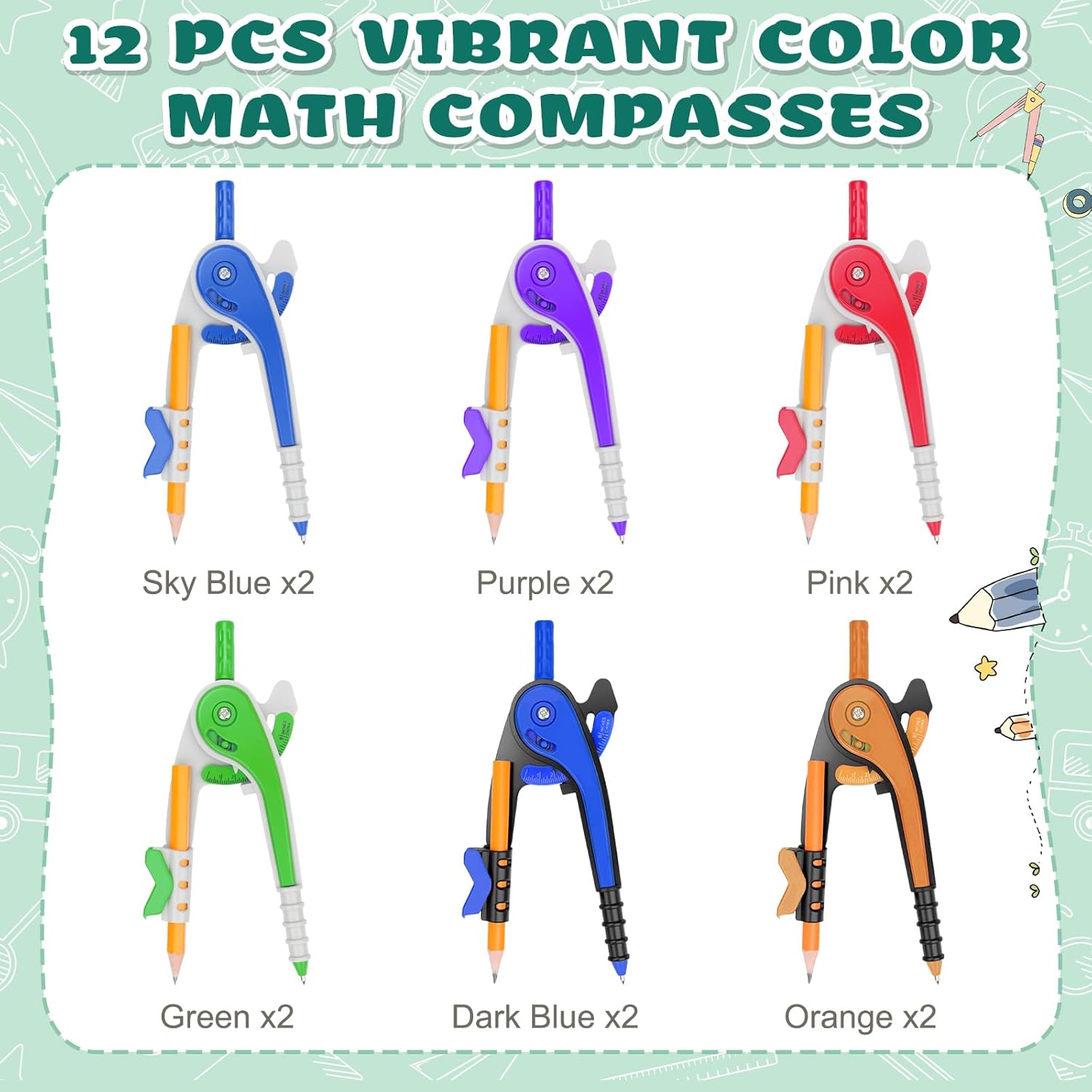 - Vibrant Colors: The geometric compass set includes 12 pieces math compasses in different colors--pink, sky blue, green, purple, blue, and orange (2 of each color), and 12 pieces clear plastic protractors and 12 pieces plastic rulers. Each math compass comes with a detachable drawing pencil. The ample quantity and bright colors make this set ideal for projects districts and teachers who need to provide multiple compasses to all