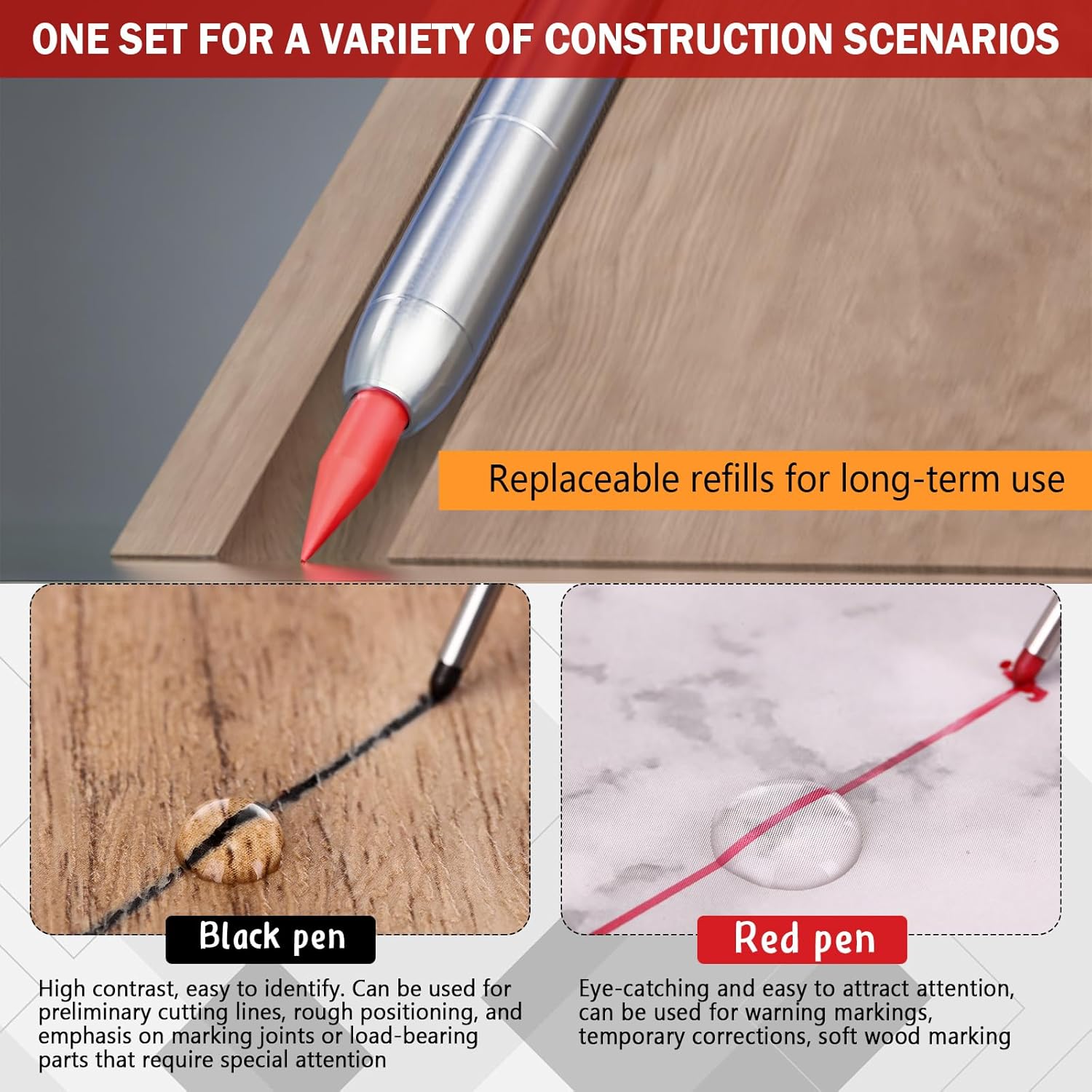 - Package Included: 8-pack mechanical carpenter pencils with 48 pcs 2.8 mm replacement cores, black, yellow, red and green color combination, black pen: black writing has high contrast on dark wood surface and is easy to identify; It can be applied for preliminary cutting lines, rough positioning, and emphasis on marking joints or load-bearing parts that need special attention; The red color is eye-catching and can be applied for warning marks, temporary corrections, and soft wood markings