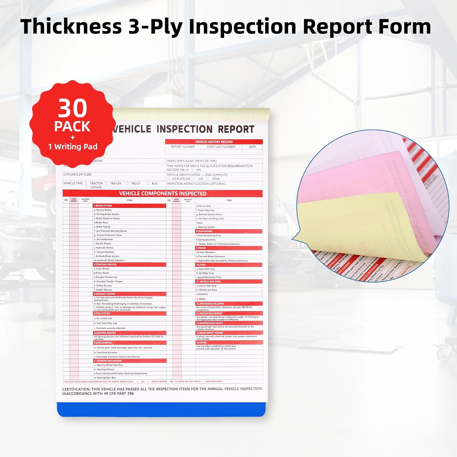 30-Pack Annual Vehicle Inspection Report Form, 3-Ply Carbonless Form and Hardboard, Includes 30-Pk 2-Ply FMCSA Vinyl Adhesive Label for Annual Inspections, DOT Compliant