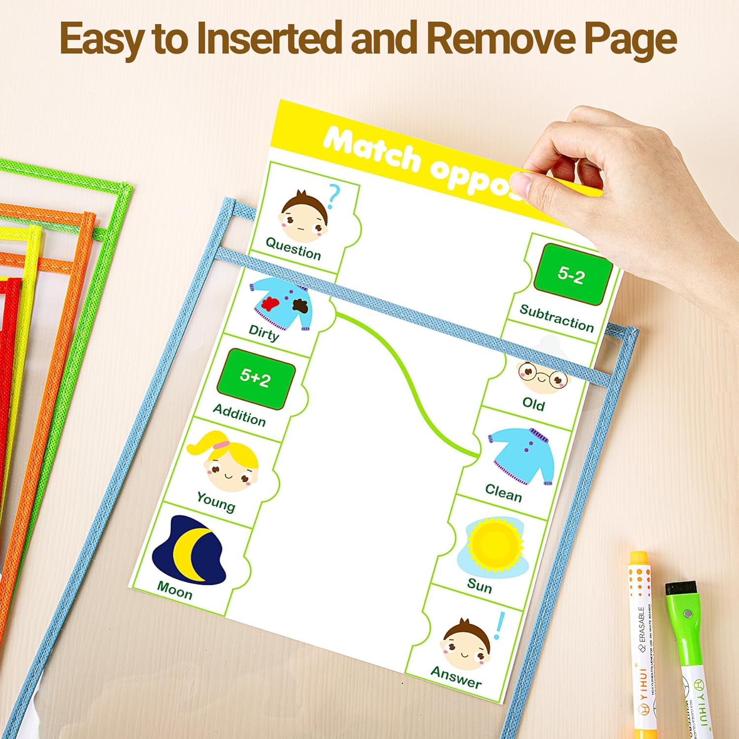 - Oversized Dry Erase Pockets: These dry erase sleeves measure 13" x 10" and can hold different types of paper, suitable for standard paper sizes(8.5x11) and worksheets (9x12). Most student activity sheets, work files, and job ticket holders can be easily inserted and removed