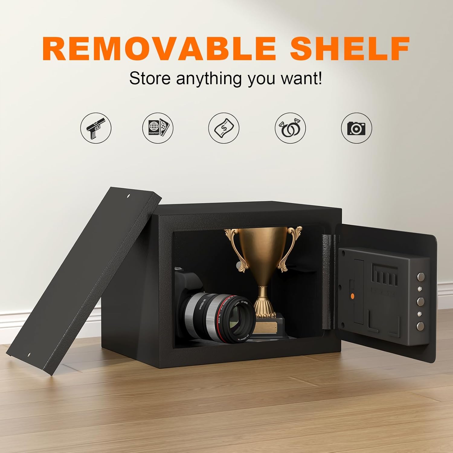 - [Removable Shelf] 🔧 The removable shelf inside gives you the flexibility to arrange the space according to your storage needs. Whether you’re storing documents, cash, jewelry, or other valuables, you can adjust the interior to keep everything organized and secure.