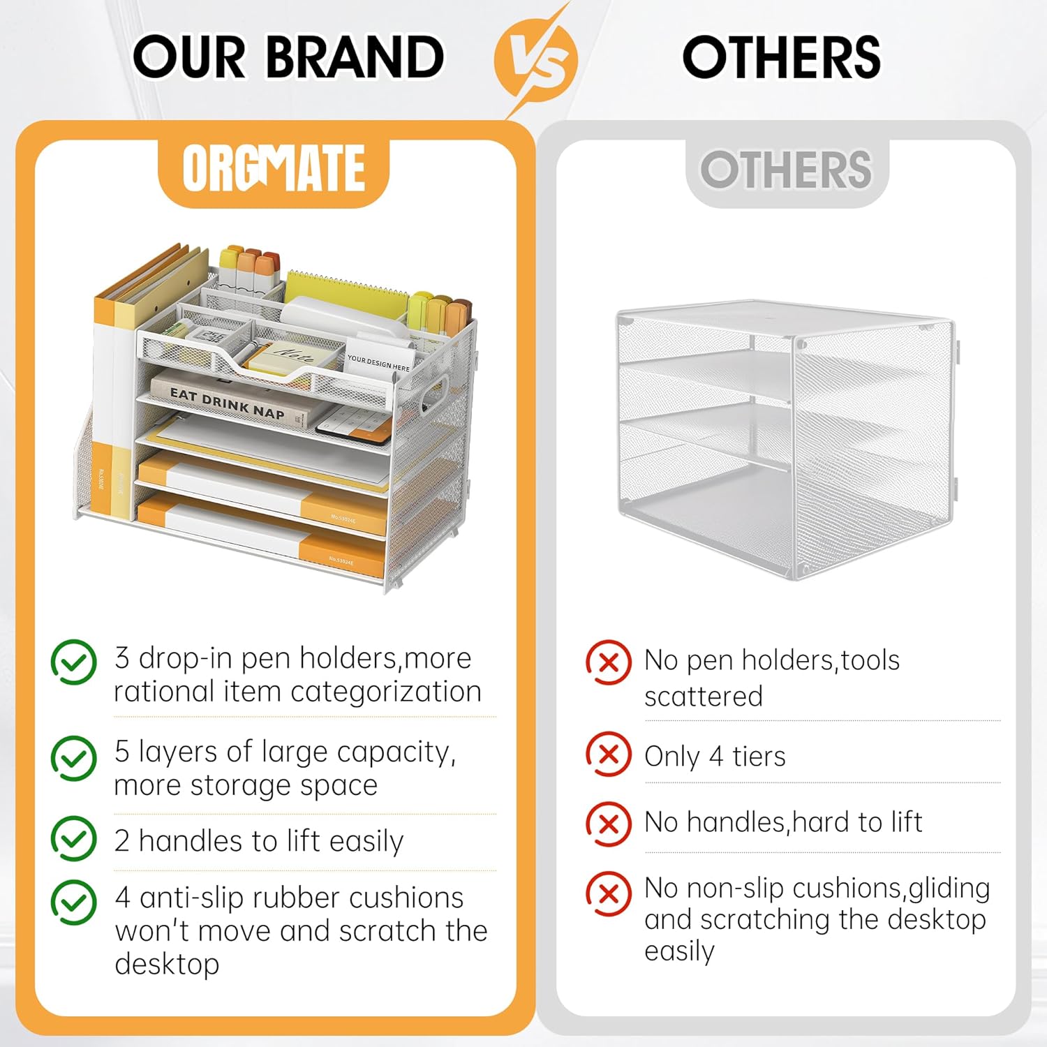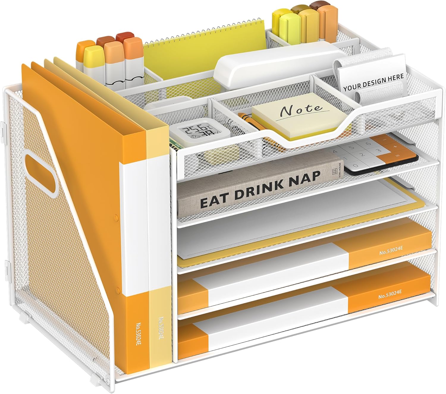 5 Tier Paper Letter Tray with File Holder and 3 Drop-in Pen Holders, Mesh Desk File Organizer with Handle, Desk Organizers and Accessories for School,Home, Office Supplies Storage-White