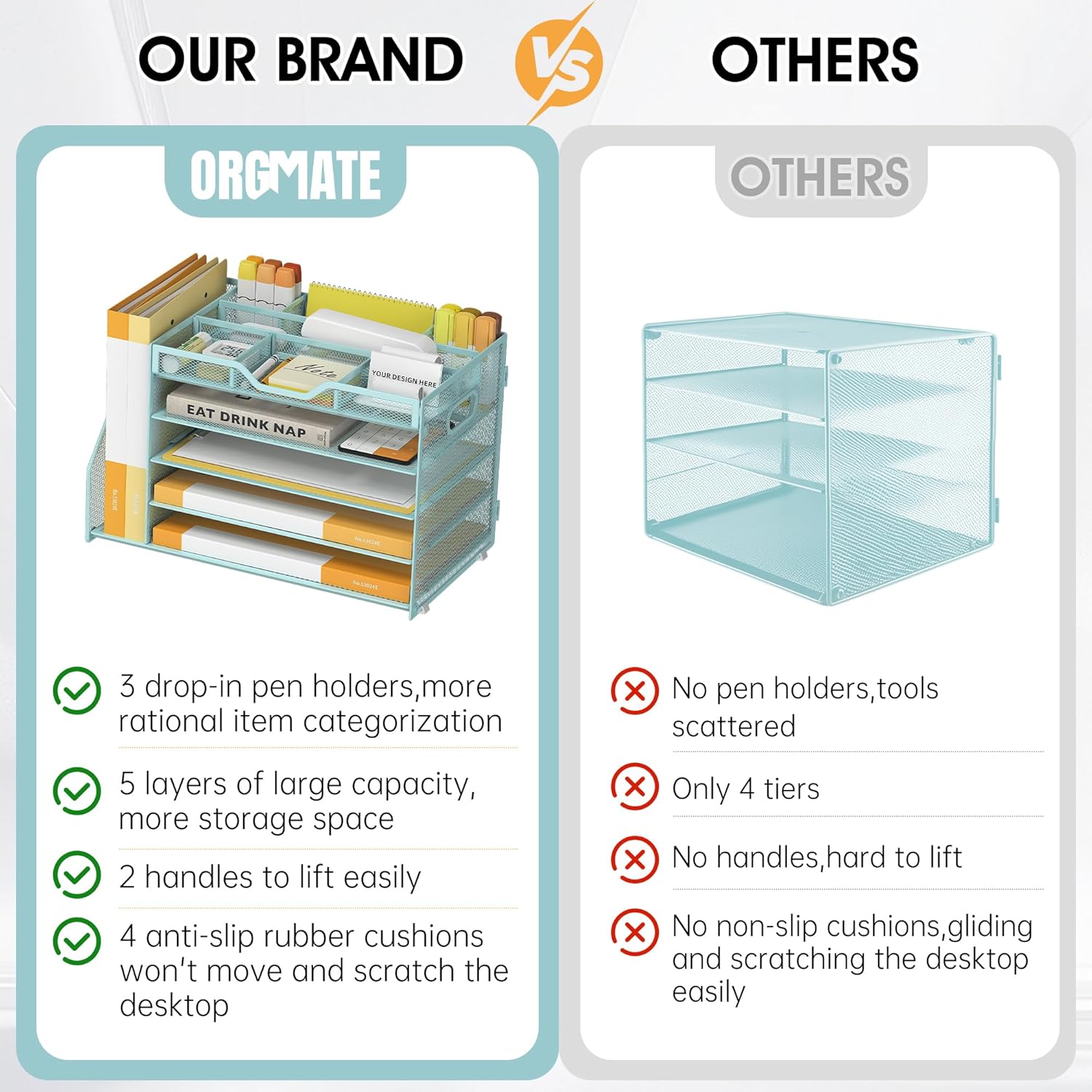 5 Tier Paper Letter Tray with File Holder and 3 Drop-in Pen Holders, Mesh Desk File Organizer with Handle, Desk Organizers and Accessories for School,Home, Office Supplies Storage-Blue