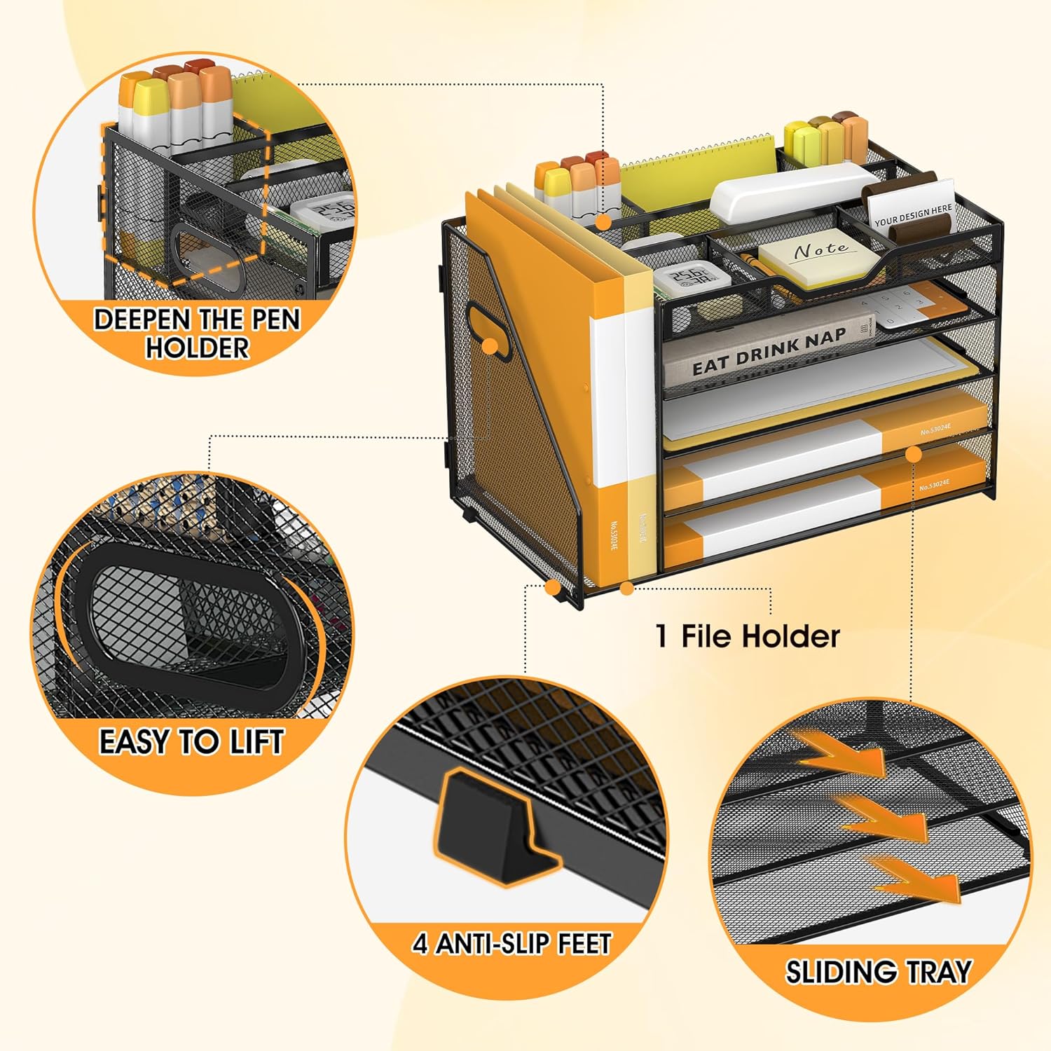5 Tier Paper Letter Tray with File Holder and 3 Drop-in Pen Holders, Mesh Desk File Organizer with Handle, Desk Organizers and Accessories for School,Home, Office Supplies Storage-Black