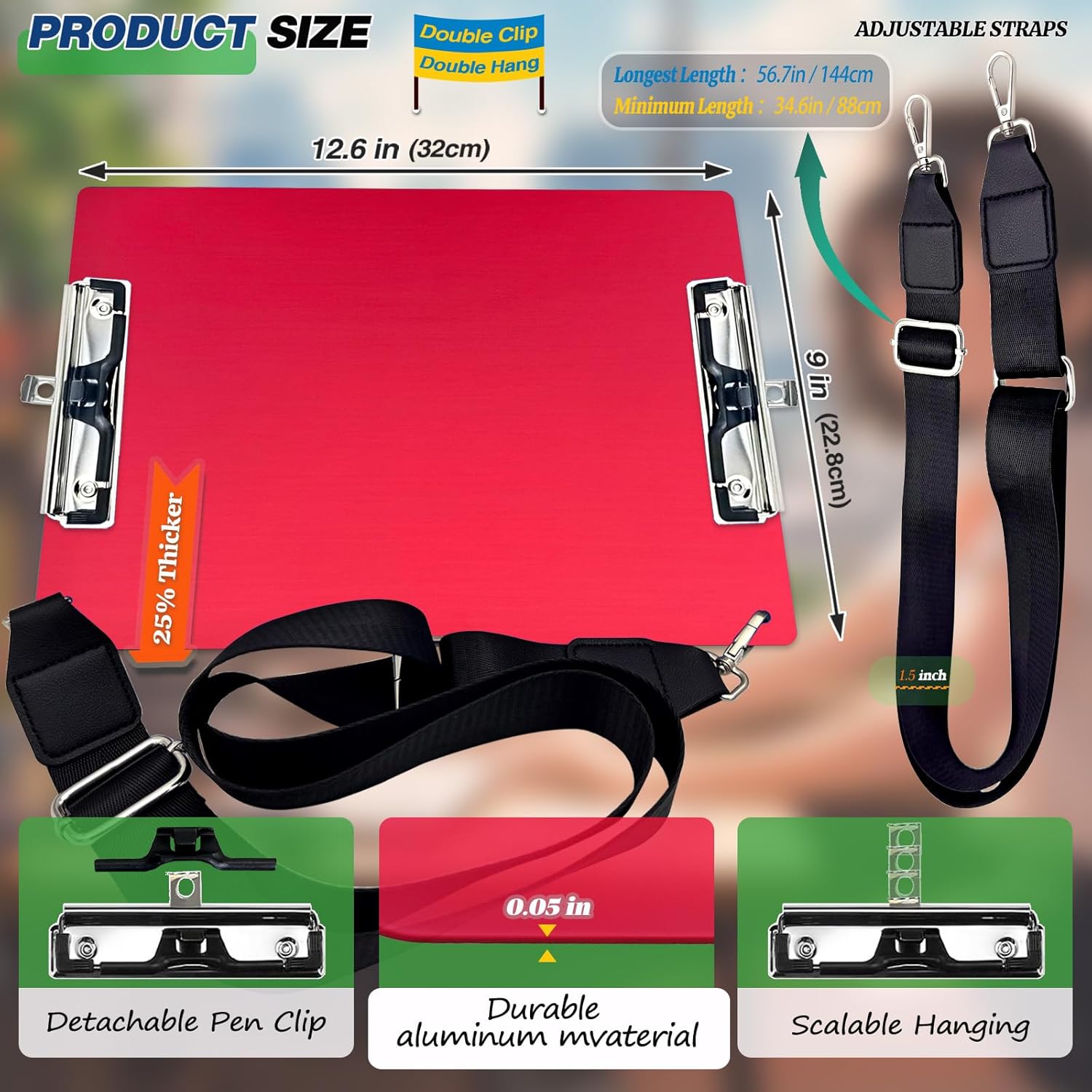 - 【Portable A4 Size】: Size: 9 × 12.6 Inch metal clipboard, Perfect for A4, letter size (8.5 in × 11 in) or downsize paper sheets documents. Shoulder strap adjusted maximum length 57 inches, suitable for a wider range of body types and usage scenarios.