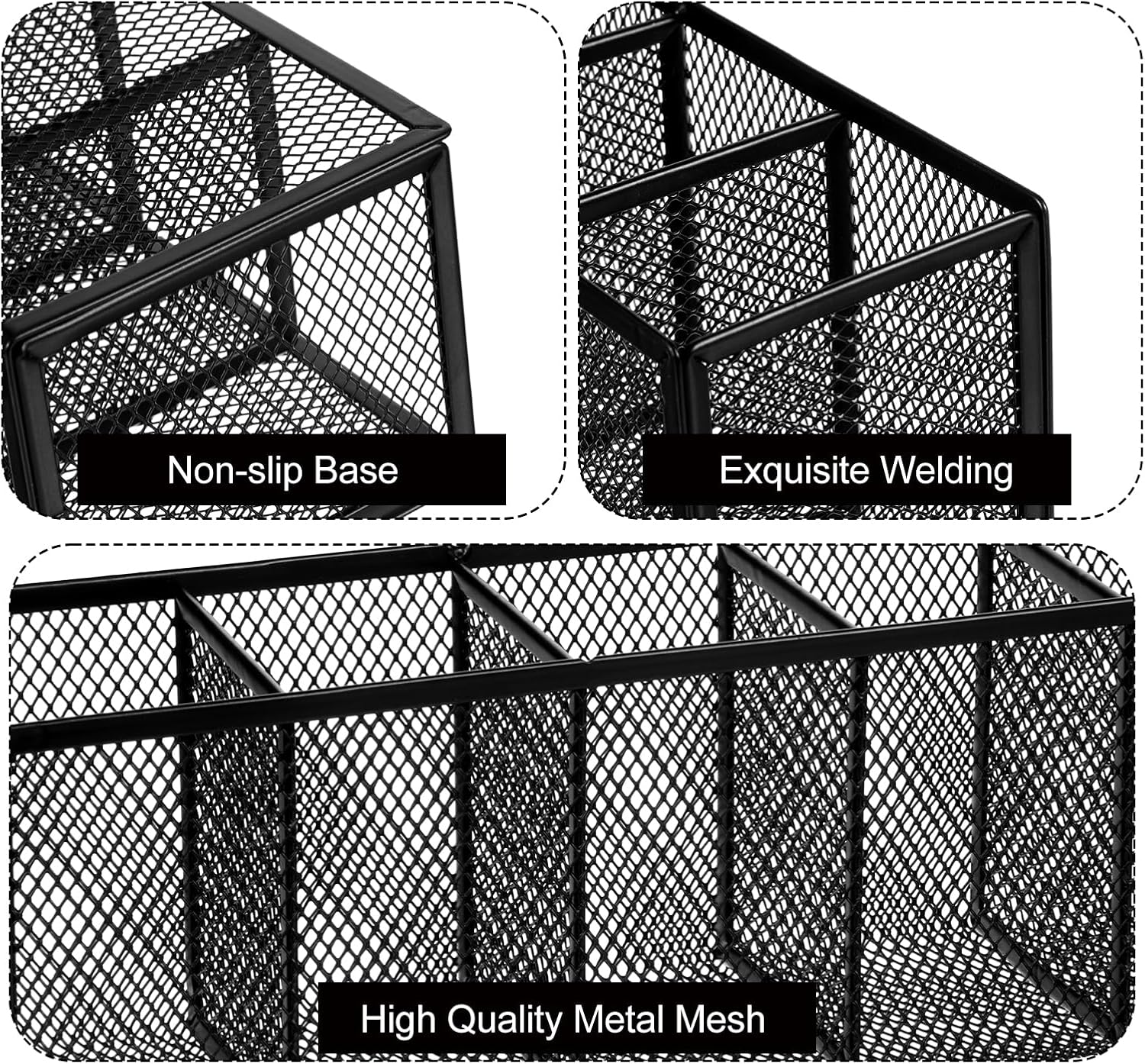 - ăDurable Metal Mesh DesignăThe black pen holder is crafted from sturdy metal mesh, ensuring long-lasting durability and resistance to wear. Its smooth edges and reinforced frame prevent scratches on surfaces or hands, while the non-slip rubber base pads provide stability. Ideal for daily use in offices, classrooms, or homes, offering a reliable solution for organizing pens, pencils, and other small items.