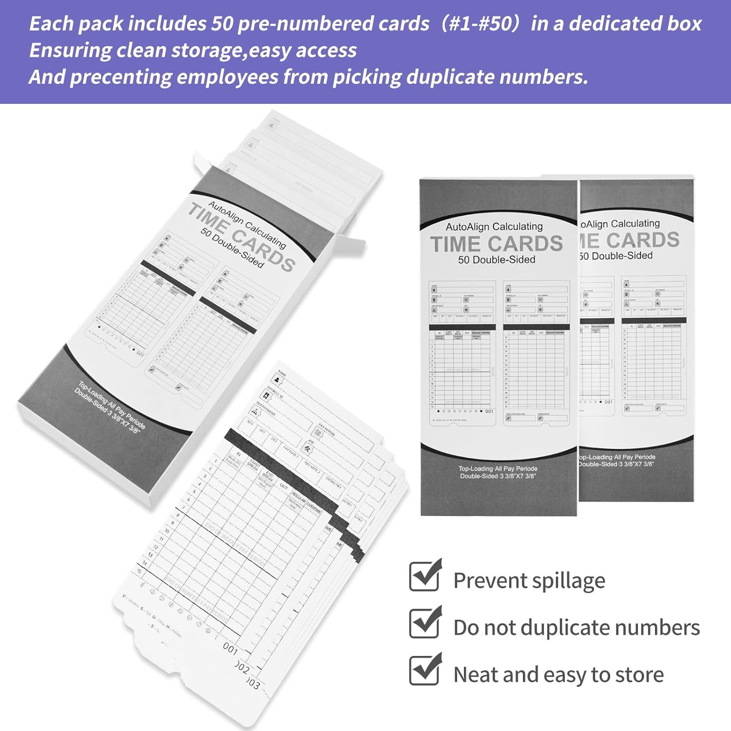 - 300 Time Cards with Organized Numbering Includes 300 employee time cards, packed in 6 individual boxes (50 cards per box), numbered from #1β#50 in each. Helps avoid duplicate entries and improves organization for any time card machine setup.
