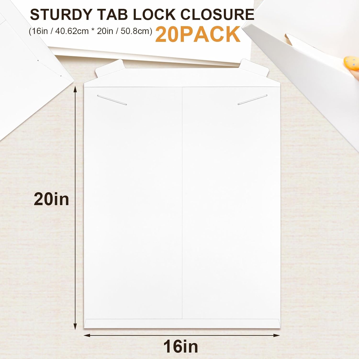 20 Pack 16x20 in Tab Lock Rigid Mailers Extra Large Sturdy Keep Flat Mailers Cardboard Envelopes Kraft Paper 250 Gsm for Shipping Photos, Packing Documents, Gift Cards, Cds, Art Prints, White