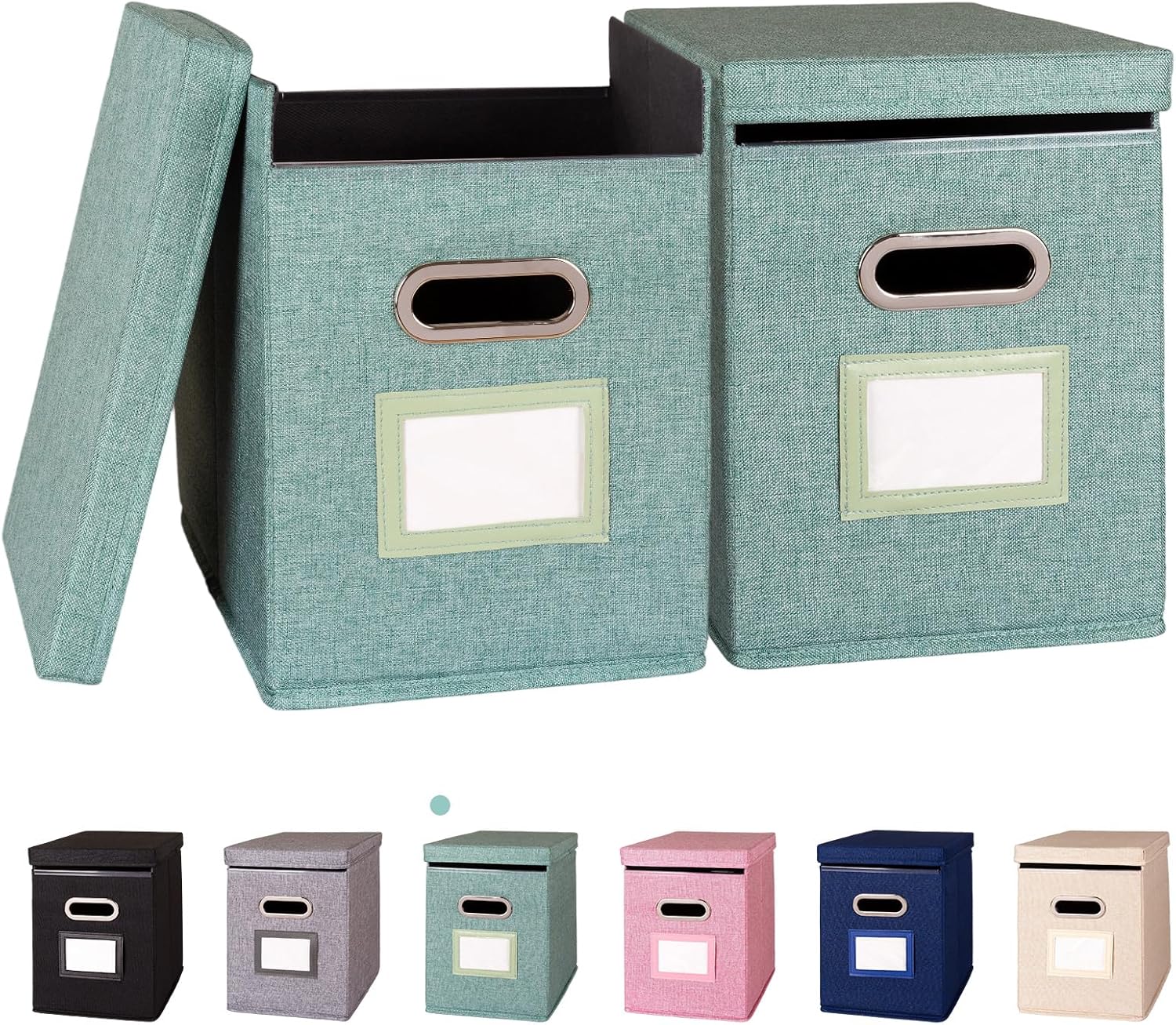 2 Pack Hanging File Folders Organizer with Lid, Letter Size Fabric File Storage Box Collapsible, Portable Office Document Holder with Metal Handle, Smooth PVC Rails, Green