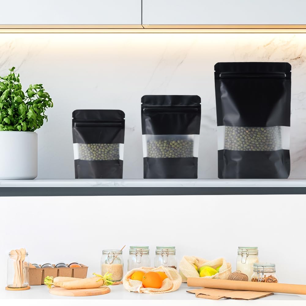 4CP 100 Pcs Black Zipper Smell Proof Bags with Window, 6.3x9.5 Inch Stand Up Foil Pouches for Food Selfsealing Storage, Reusable Bag for Packaging Small Business, Cookies, Nunt, Candy