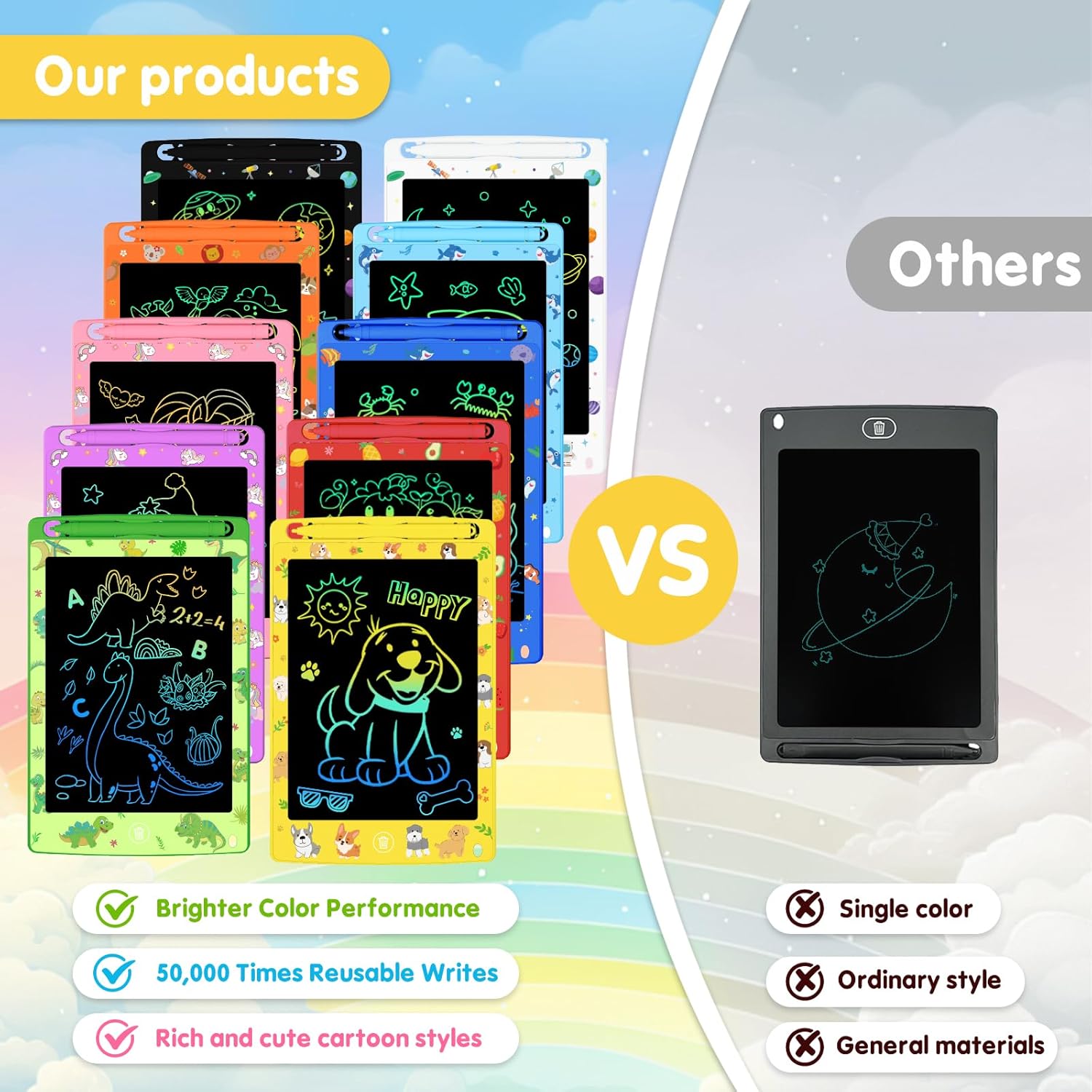 - 10 Pack for Share: Our product features 10 unique themes. This allows multiple kids to play together or provides ample opportunities for a single child to explore different themes. These tablets go basic beyond writing tools. As children draw, they can embark on creative journeys through various imaginative worlds. Equipped with pressure - sensitive technology, children can create lines with varying thicknesses, adding more fun to the creative process.