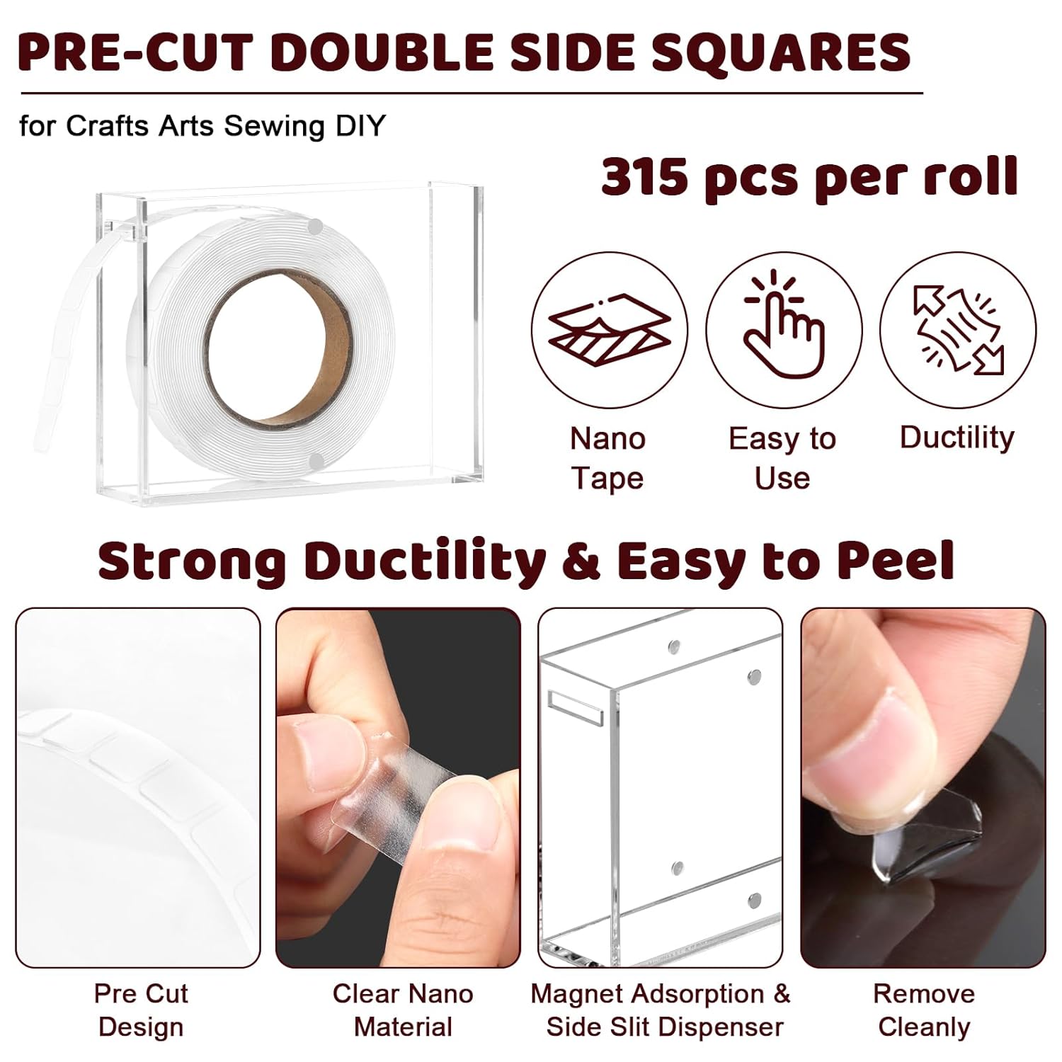- 【All-in-One Nano Tape & Acrylic Storage Kit】This set includes 1 roll of precut 0.5x0.5 inch nano tape double sided squares (315 pieces per roll) and 1 clear 4.3x3.5x1.4 inches acrylic dispenser box. The dispenser features a narrow side slit and magnetic closure for convenient access and secure storage. Designed for efficient use, this double sided tape for walls removable solution is perfect for quick setups, DIY crafts, or mounting to wall without drilling. Ideal for anyone looking for functional and stylish crafts decoration supplies.
