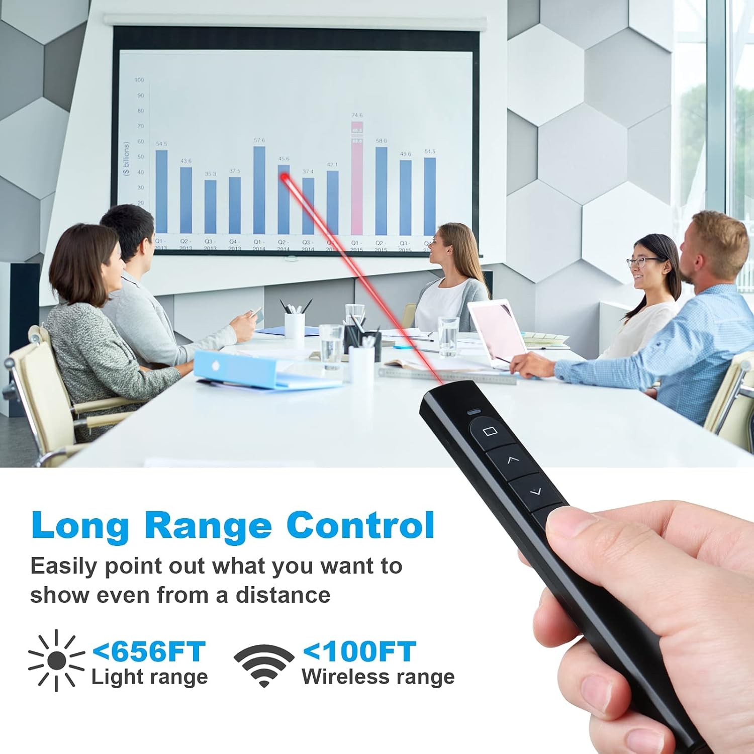- [100 FT Long Control Range] UBUYONE Wireless Presenter remote is equipped with top-grade microchip to ensure a real 100M/328FT long control distance, Red light range: 200M/656FT. Power point presentation clickers produces a bright red light that's easy to see against most background.