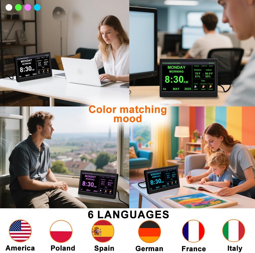 - 【Clock only supports a 2.4G WIFI, Not 5G WIFI】【Global Weather & Auto Time Sync】:<1-second precision network time sync, dual temp sensors for indoor/outdoor readings, city choose, real-time weather & 5-day forecast, switchable calendar/clock modes