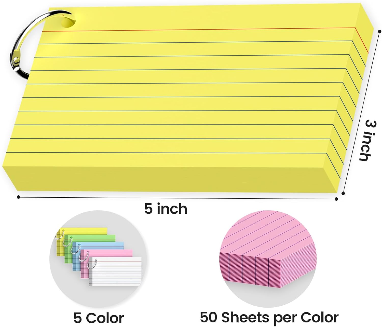 250-Pack Colored Index Cards 3x5 Inch w/Key Ring – 180gsm Heavyweight Flashcards – 5 Vibrant Colors Flash Cards (White Pink Blue Yellow Green) – Perfect for Study & Notes, Students School Supplies