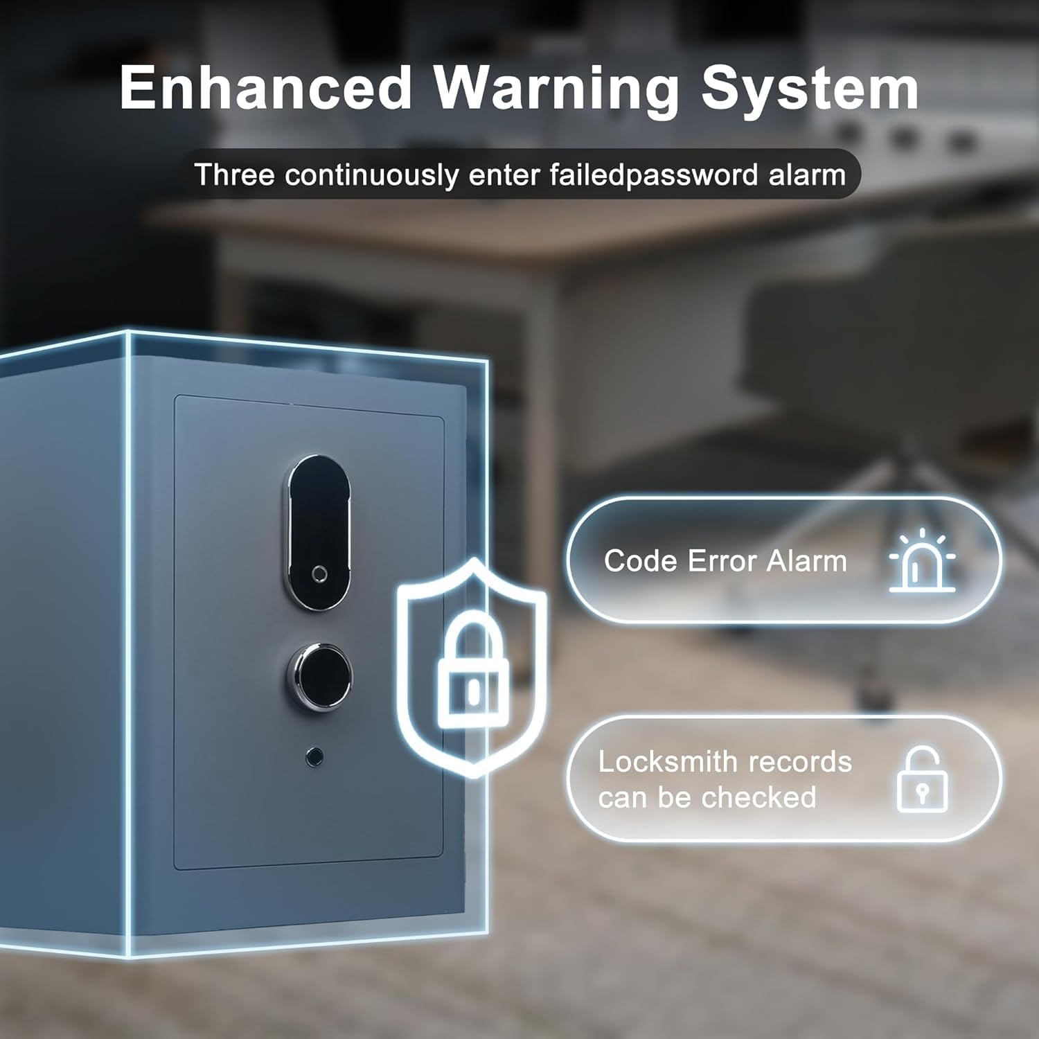 - â ăIntelligent Designăâ The safe has a door opening record function. ⥠Equipped with digital encryption technology (press the "*" key before entering the password to activate (the input content will be hidden). ⢠The safe is subjected to severe vibrations, which will trigger the vibration alarm system. ⣠Three consecutive attempts to enter an incorrect password will trigger the alarm system. â¤Built in LED light, equipped with fire-resistant and waterproof file bag.